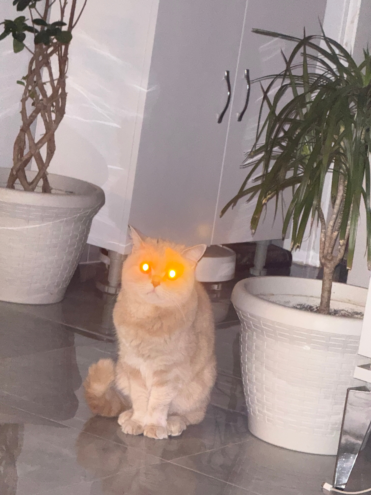 A light orange cat with bright orange eyes is sitting on a gray tiled floor between two large white potted plants with greenery. The scene is indoors, potentially near a white wall with reflective met…read more