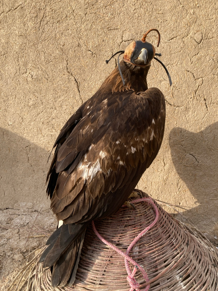A large, dark brown raptor, identified as an eagle, is depicted in a close-up, angled shot. The bird's plumage is predominantly dark brown, with visible lighter brown and white mottling on its chest a…read more