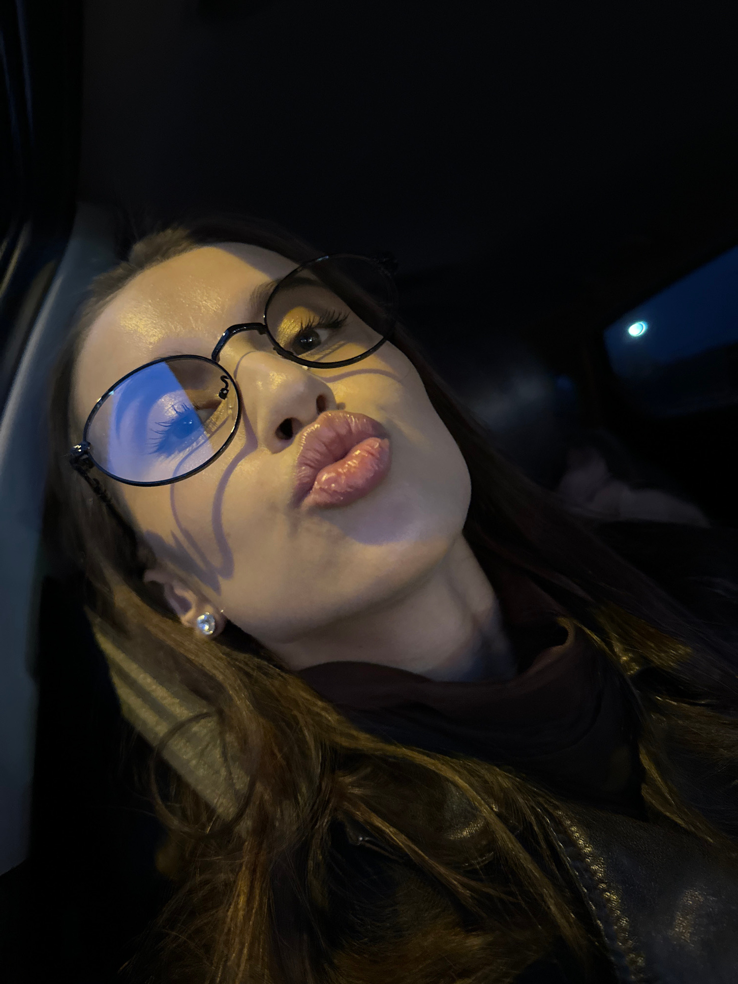 A portrait-style photograph captures a woman indoors, presumably in a car at night. The photo is oriented such that the woman's face is angled, with her head tilted to the left. She wears round glasseβ¦read more