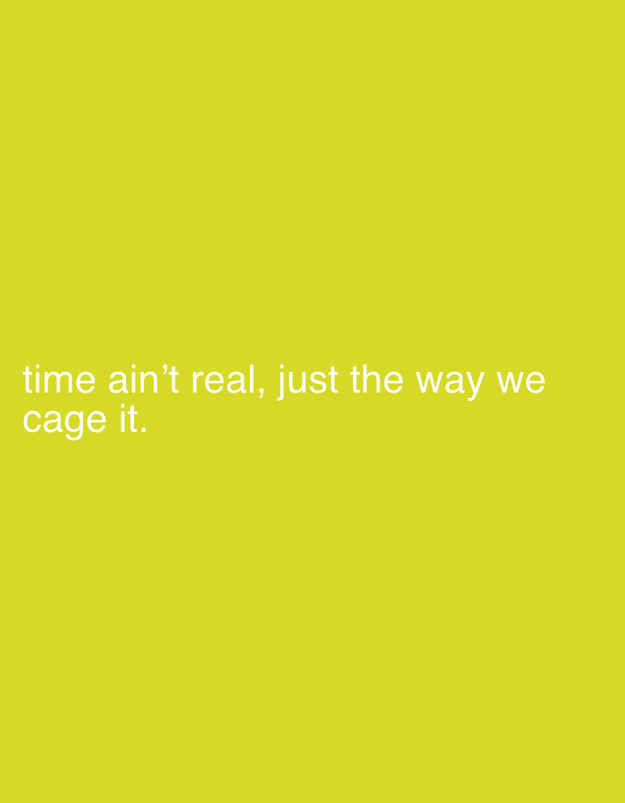 The image shows a solid yellow background with the text "time ain't real, just the way we cage it." in a white, sans-serif font, located in the bottom left corner of the frame. There is no evidence to…read more