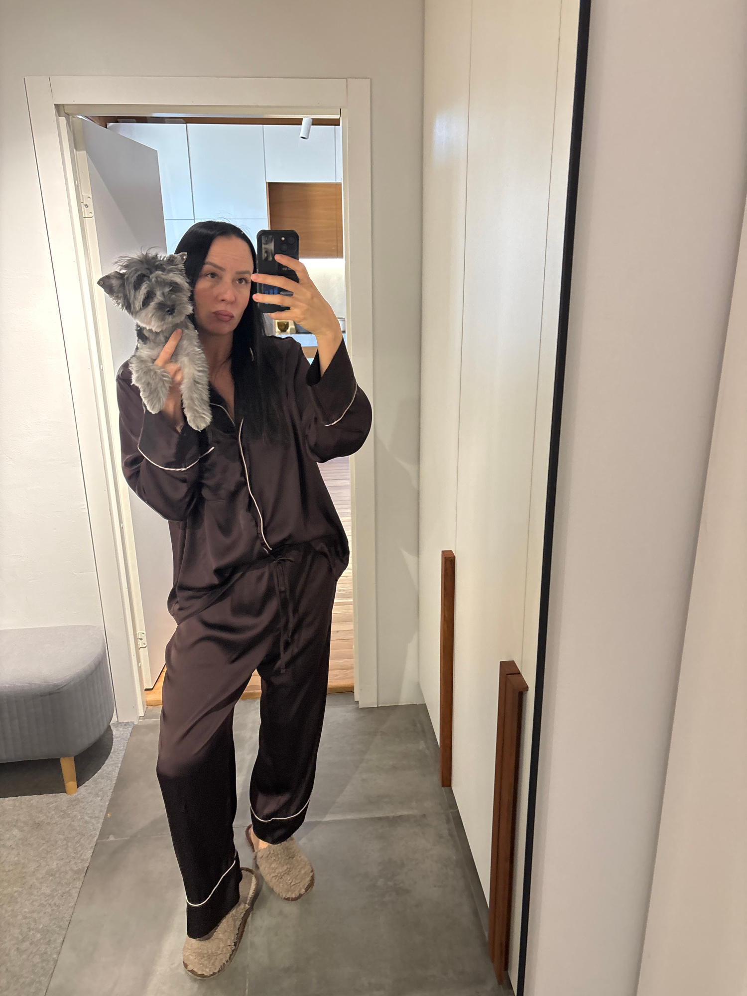 A person wearing brown pajamas and fuzzy slippers holds a gray schnauzer dog while taking a selfie in a mirror. The person is standing in a room with a white wall, gray floor, and a gray upholstered b…read more