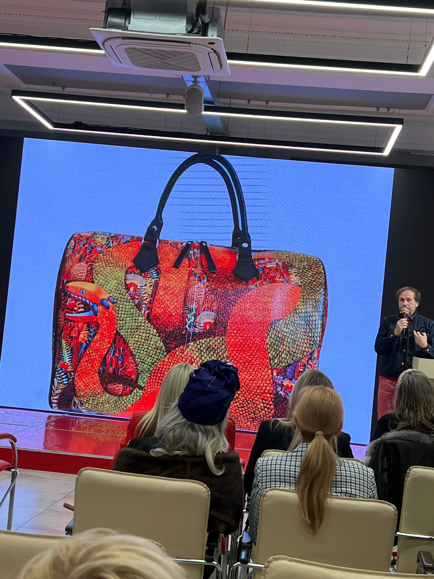 Captured indoors, seemingly in Saint Petersburg, Russia, the image presents a speaker addressing an audience in front of a screen showcasing a large handbag. The handbag features a unique, vibrant desβ¦read more
