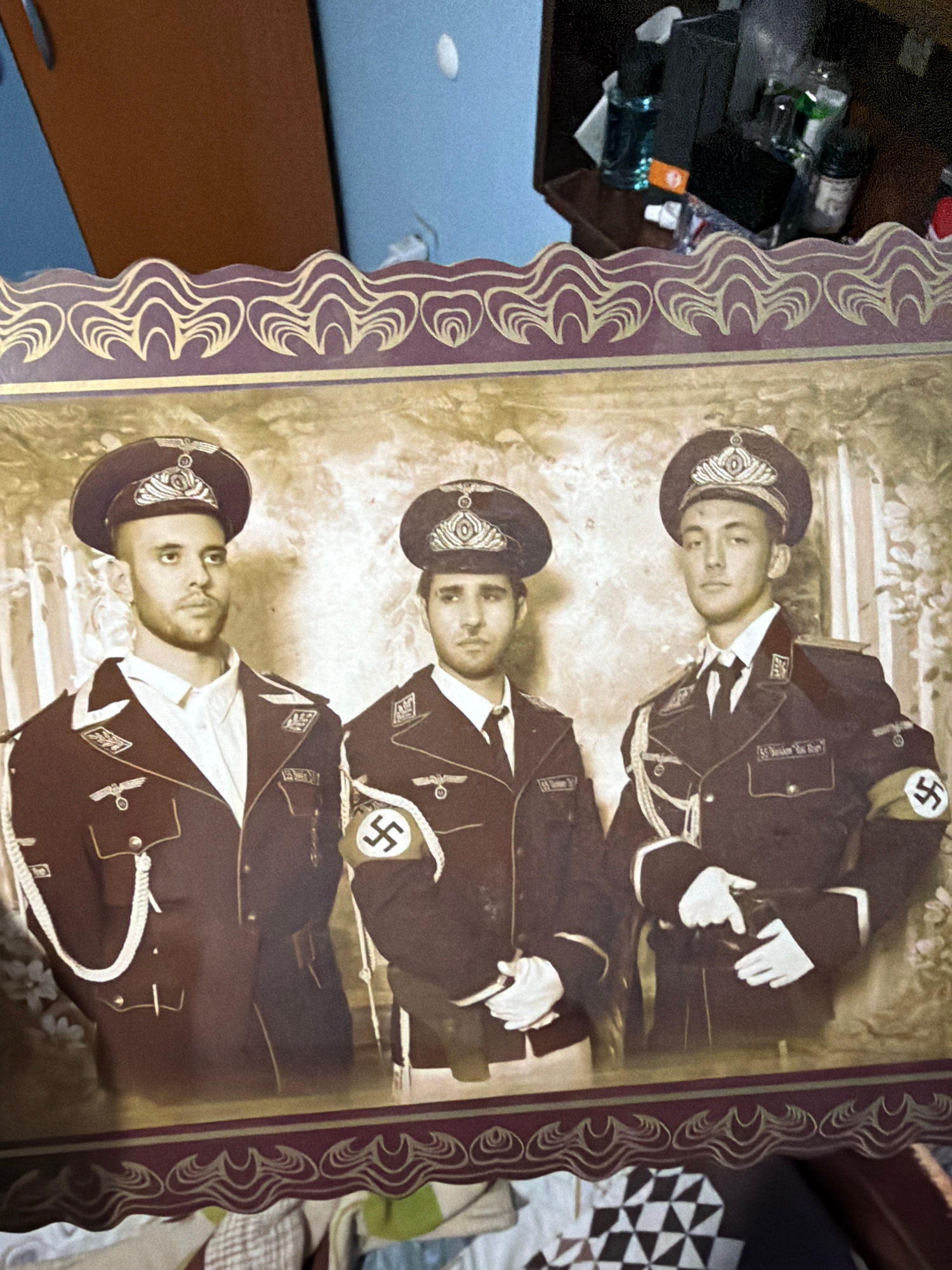 The image shows a framed photograph of three men in Nazi German military uniforms with swastika armbands. The men are standing and wearing peaked caps, white gloves, and dark uniforms with light-color…read more