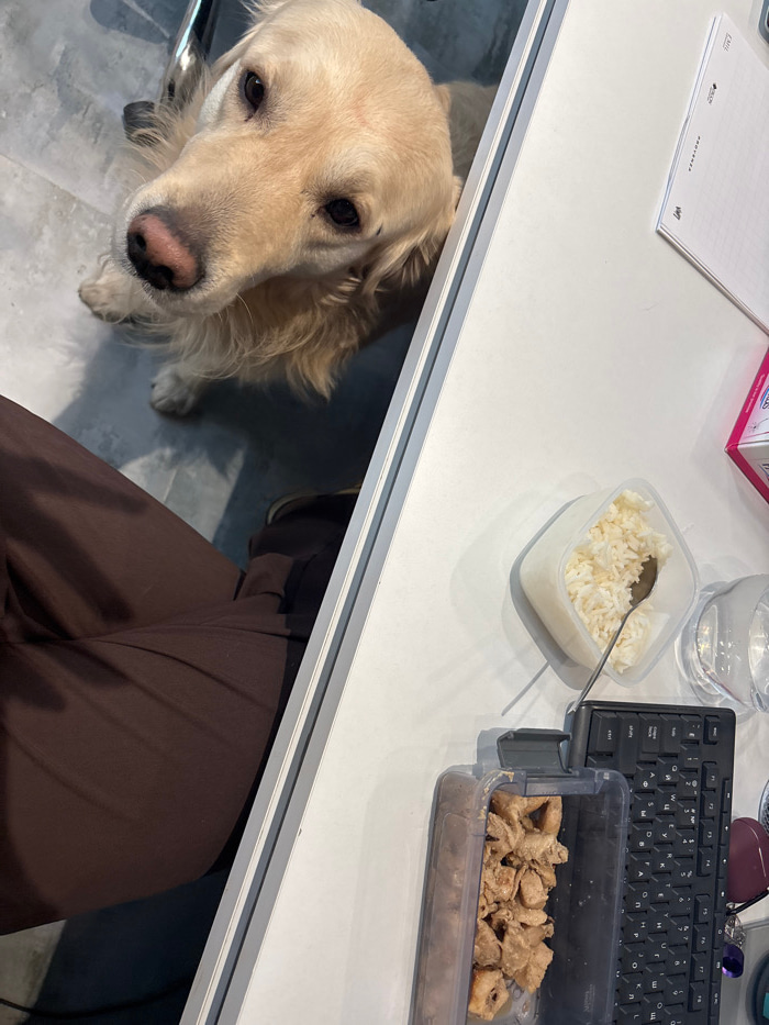 An indoor scene in the city of Zovuni, Armenia, features a Golden Retriever dog on a light grey tiled floor, positioned beneath a white desk. The dog, with light-colored fur, a pink nose, and dark eye…read more