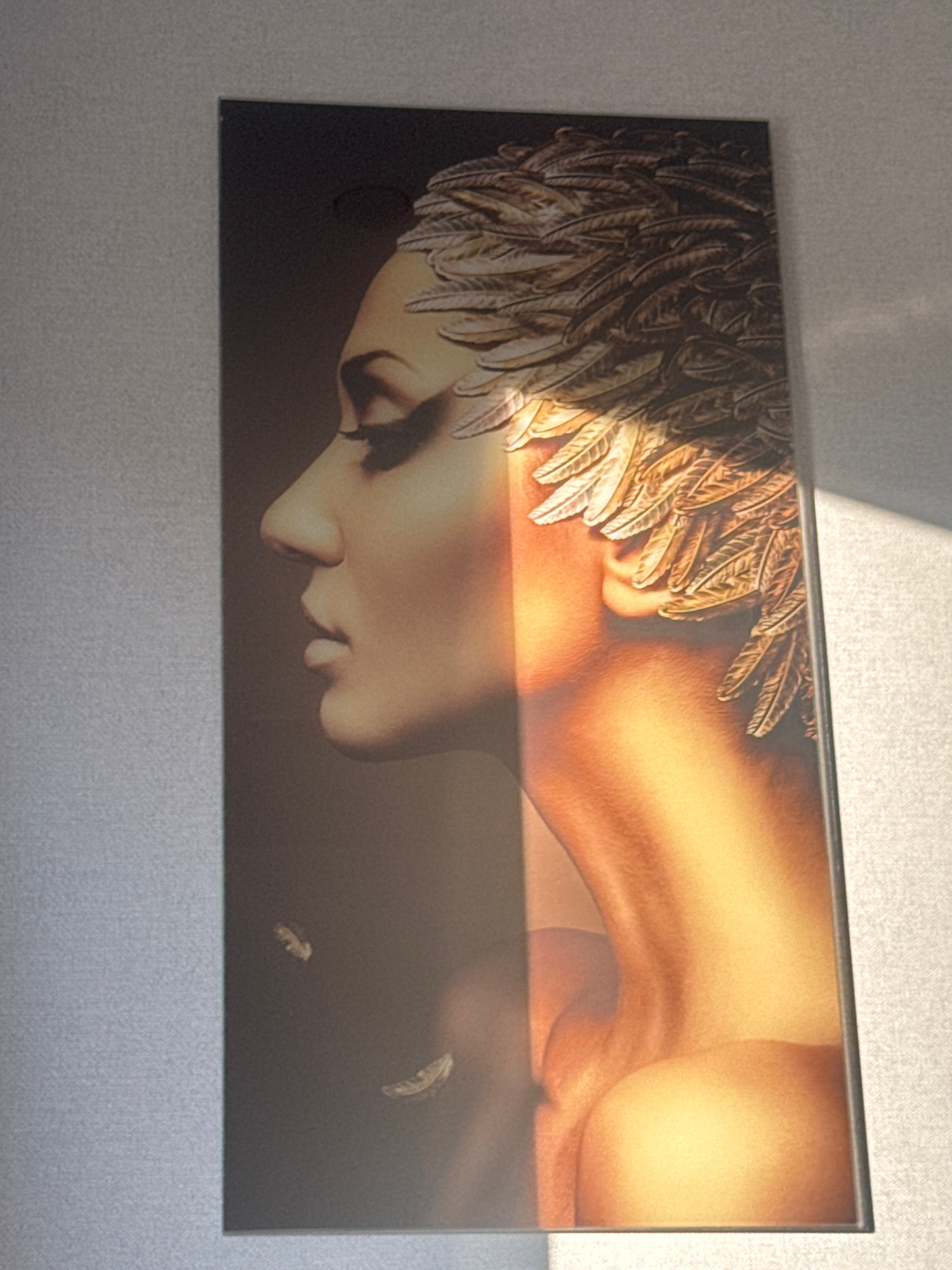 A framed image hangs on a light gray wall, partially illuminated by a ray of sunlight from above. The image depicts a person with feathers around their head and shoulders. The background of the image…read more