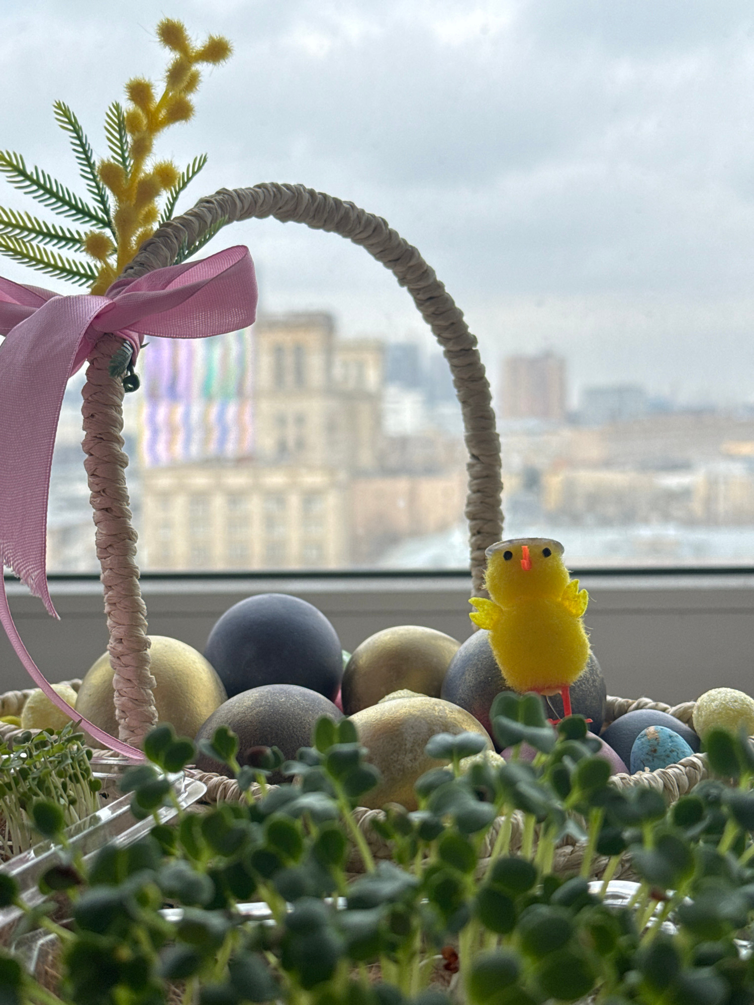 A close-up, tilted, and slightly out-of-focus shot shows an Easter basket. The basket is filled with colored eggs. A small yellow chick adorns one of the eggs. A pink ribbon and some yellow mimosa are…read more