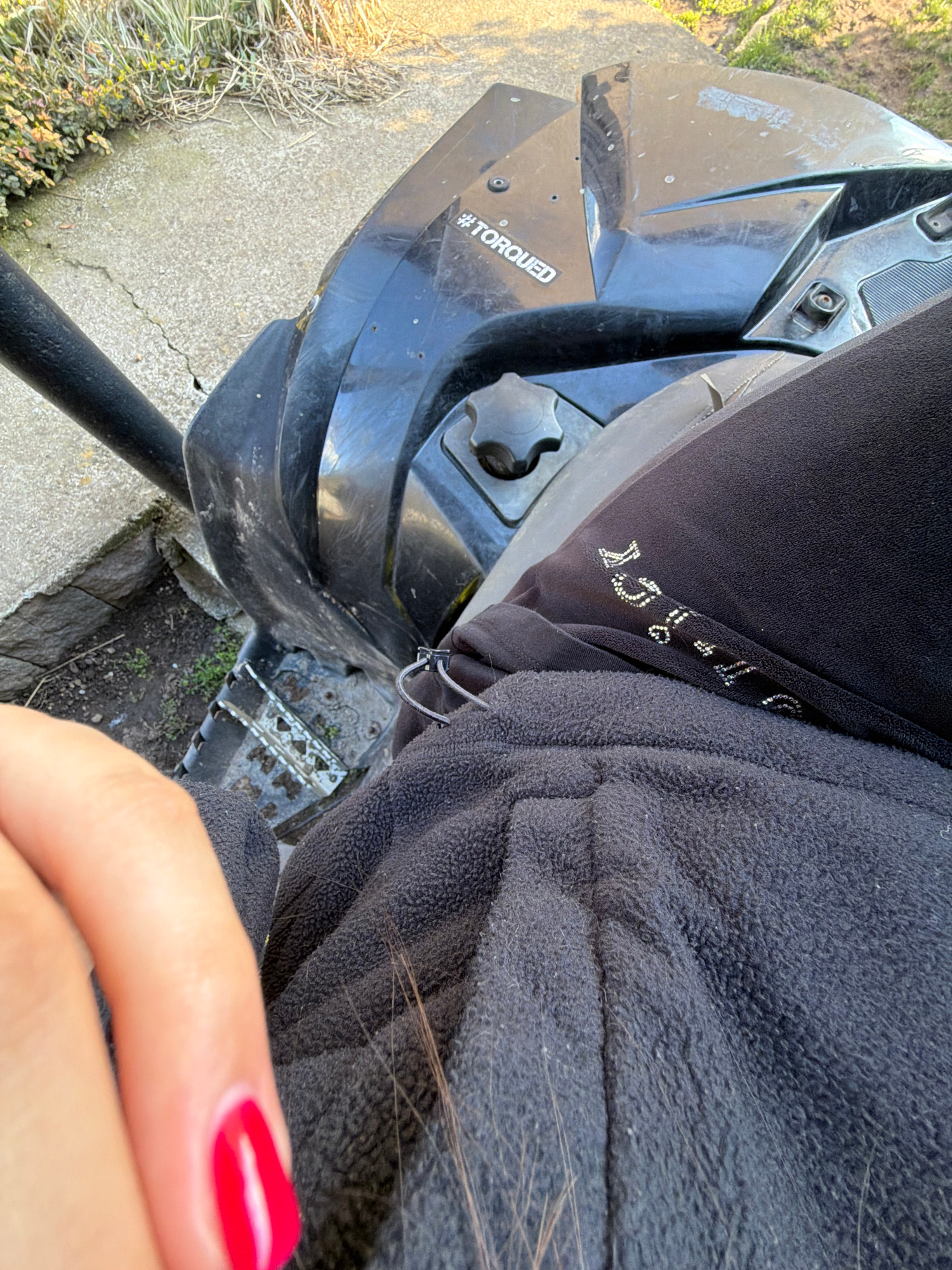 The image shows a partial view of an all-terrain vehicle (ATV) on a concrete surface. The front left fender of the ATV is visible, with the word "#TORQUED" printed on it. A person is seated on the ATV…read more