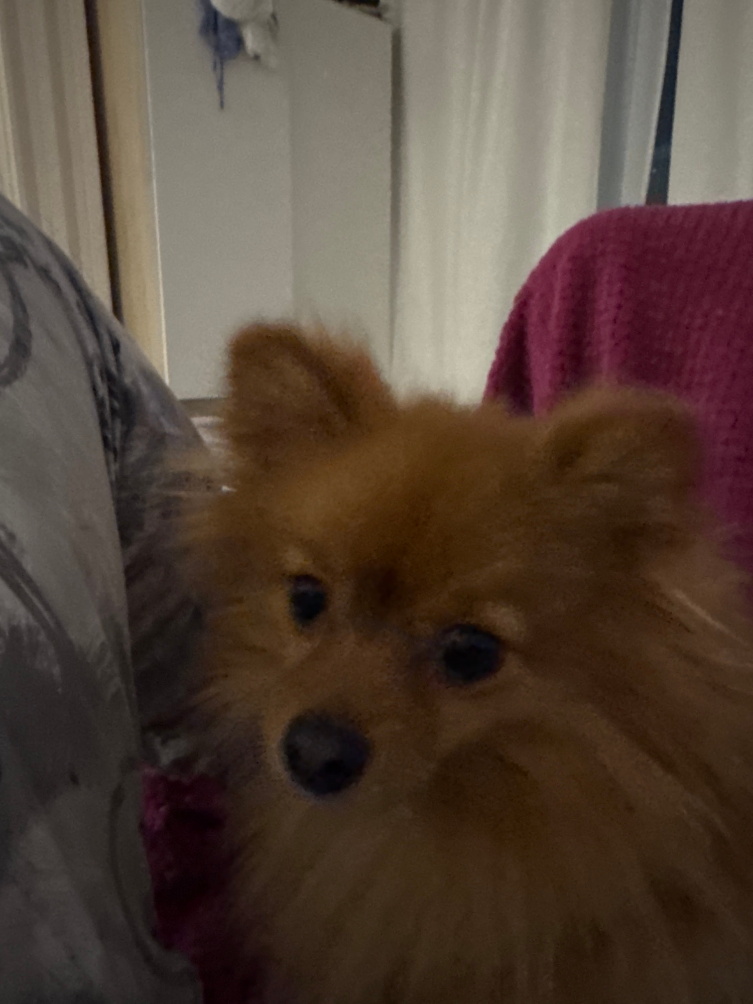 A brown, fluffy dog with dark eyes and a black nose is the primary subject of the image. The dog is positioned close to the camera, appearing slightly tilted. The background includes a pink knitted fa…read more