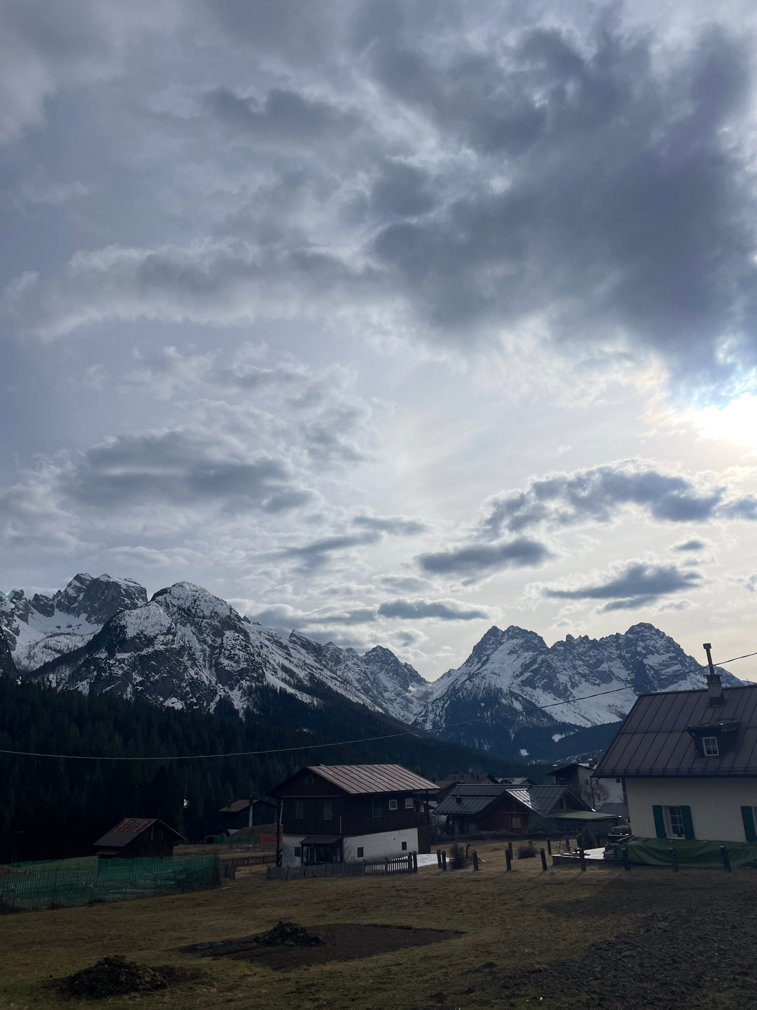 The image depicts a mountainous landscape with buildings in the city of Sappada, Italy. The sky is overcast with gray and white clouds, and the sun is obscured by the clouds. Snow-capped mountains are…read more