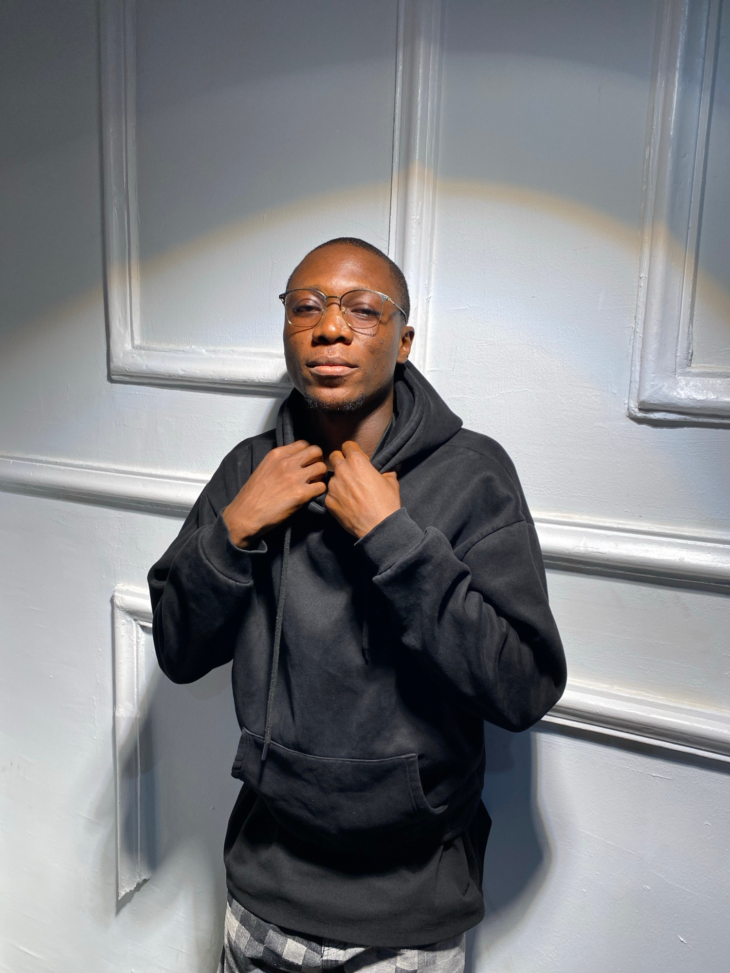 A young Black man, likely in his 20s or early 30s, is depicted in an indoor setting. He has short hair, a slight beard, and wears round, thin-framed glasses. He is dressed in a black hooded sweatshirt…read more