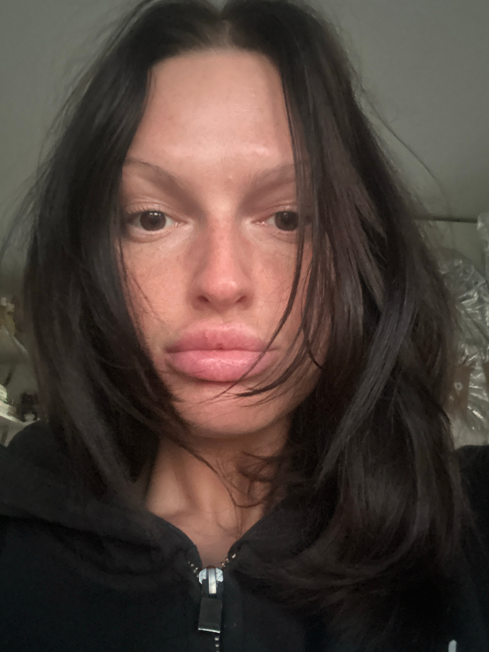 A close-up, head-and-shoulders portrait depicts an adult female facing the camera directly. Her dark, medium-length hair frames her face, appearing somewhat disheveled. Her complexion shows visible fr…read more