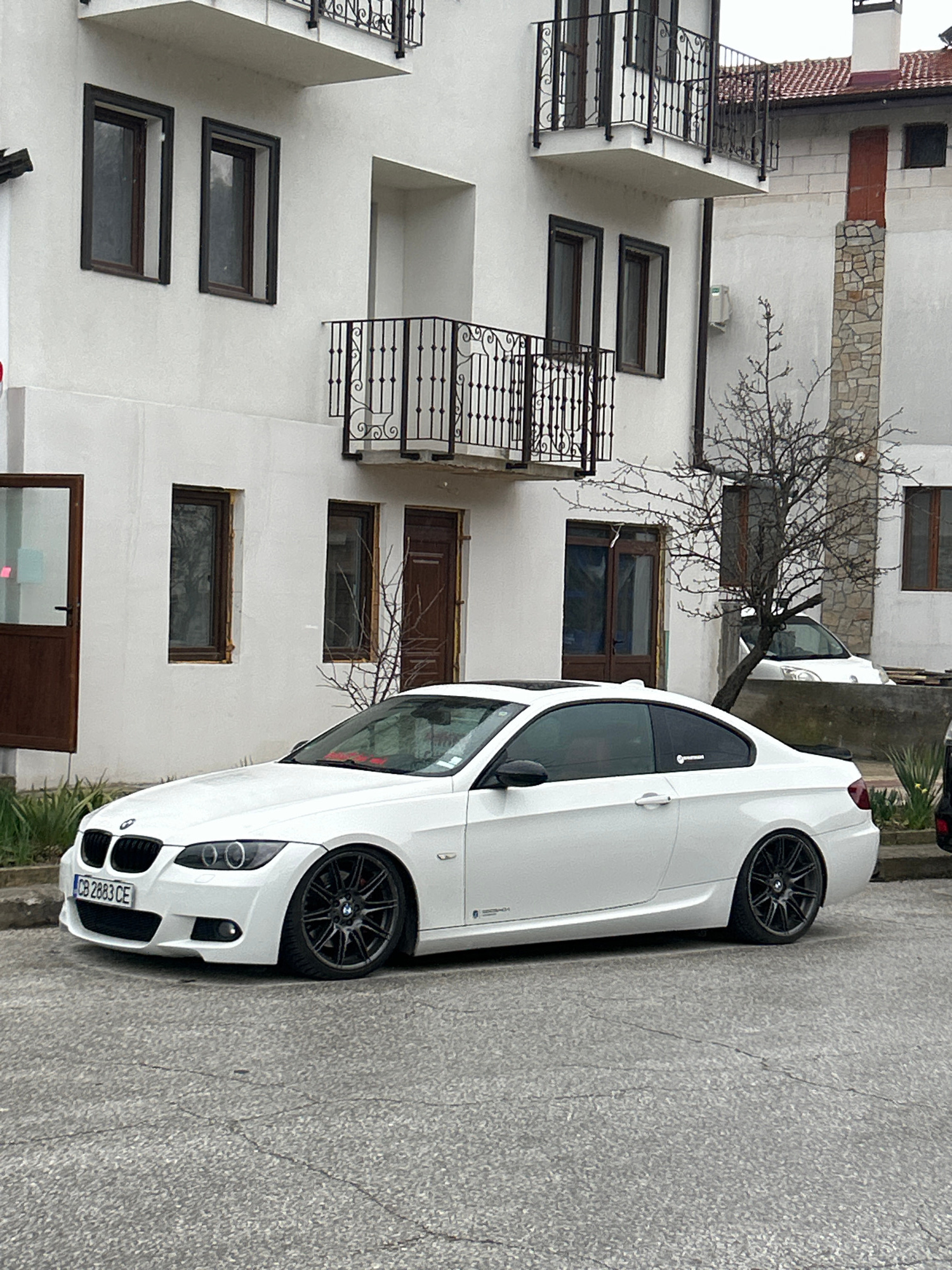 A white two-door BMW E92 coupe, featuring dark multi-spoke wheels, a sunroof, and a lowered suspension, is parked on a cracked grey asphalt surface. The vehicle bears a Bulgarian license plate "CB 288…read more