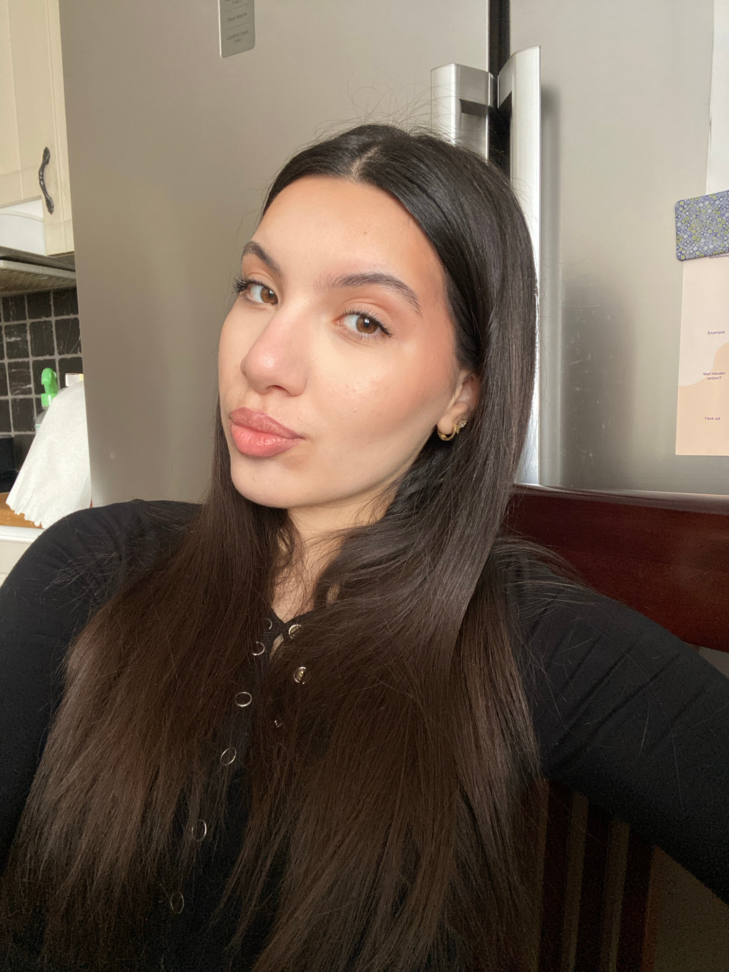 A woman is photographed indoors, likely in a kitchen. She has long, dark brown hair and is wearing a black top. She is wearing a small gold earring in her left ear. Her head is tilted slightly. A refr…read more