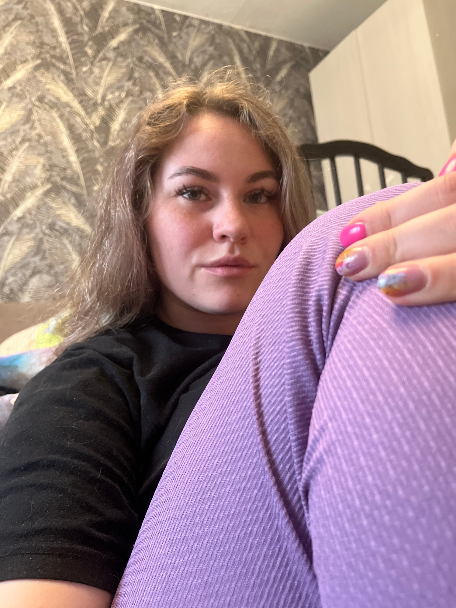A close-up, selfie-style portrait captures a young woman resting indoors, looking directly at the camera. Her face, positioned centrally in the lower half of the frame, reveals her left eye, nose, and…read more