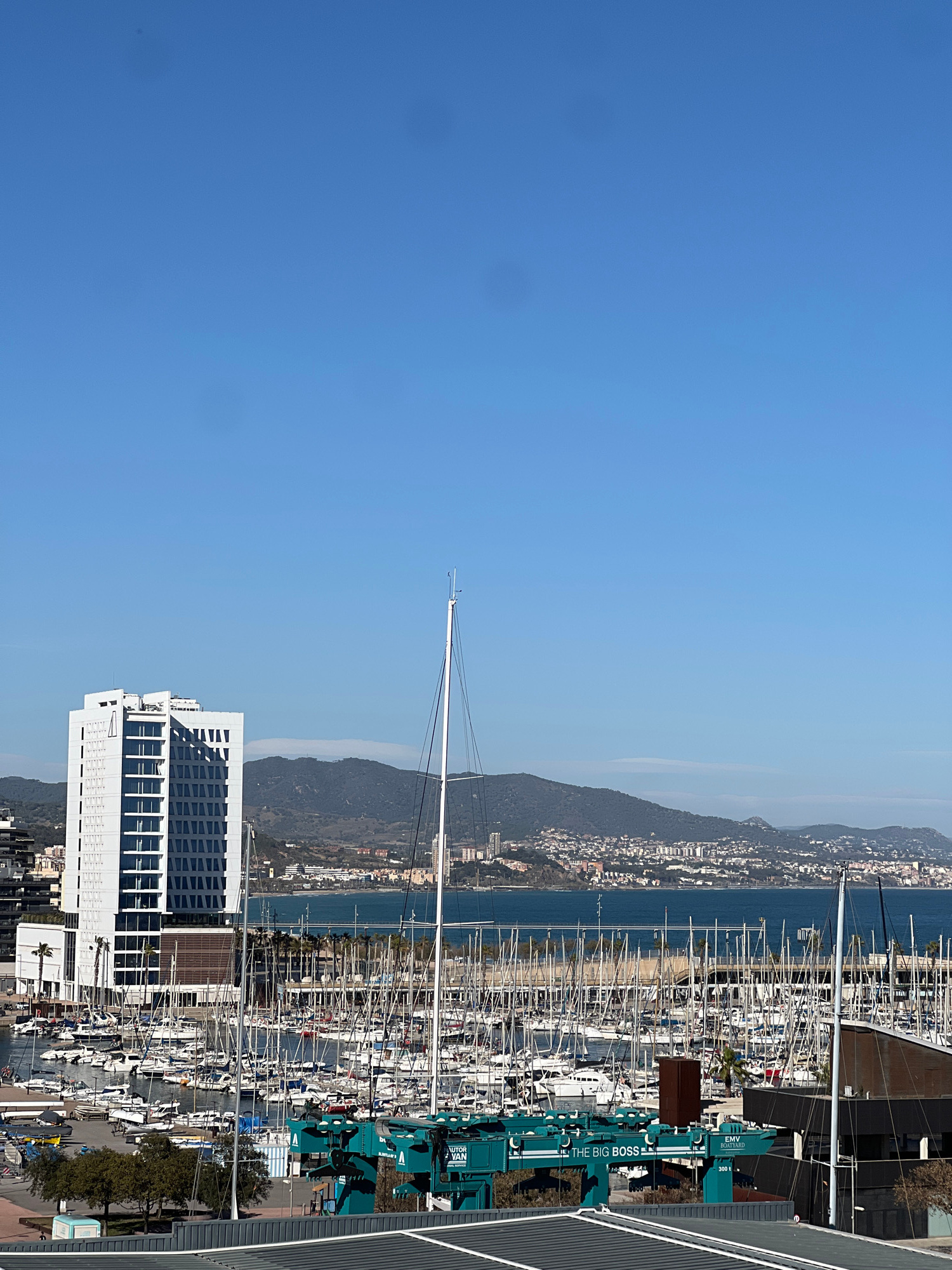 The image shows a harbor scene in Badalona, Spain. Numerous sailboats are moored in the harbor, their masts reaching skyward. A large white building with a gridded facade stands near the harbor. A cra…read more