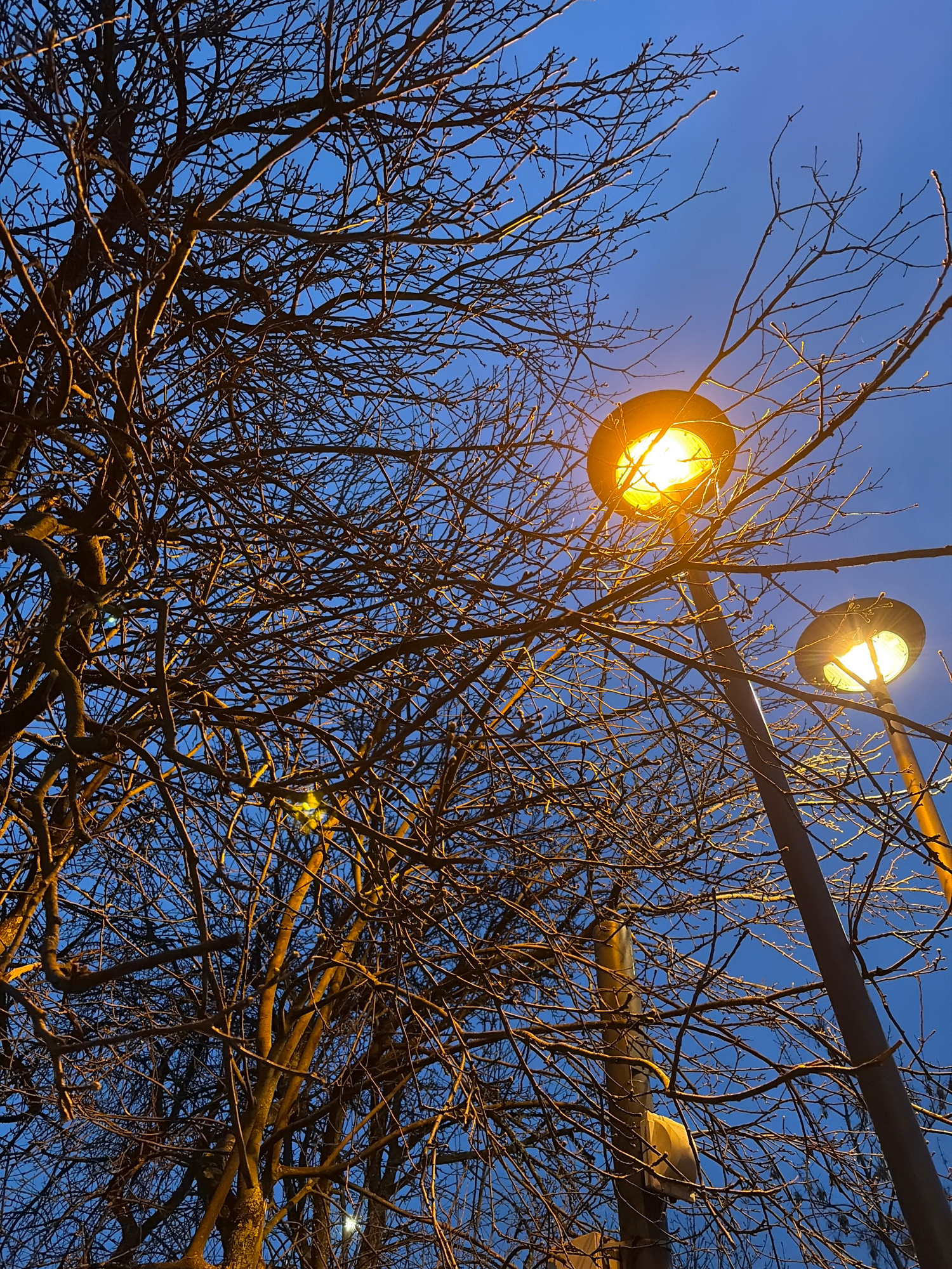 The image shows a street scene at dusk or night. Two lit street lamps are visible, their yellow light illuminating a bare tree with many branches. The sky is a gradient of blue, darker at the bottom a…read more