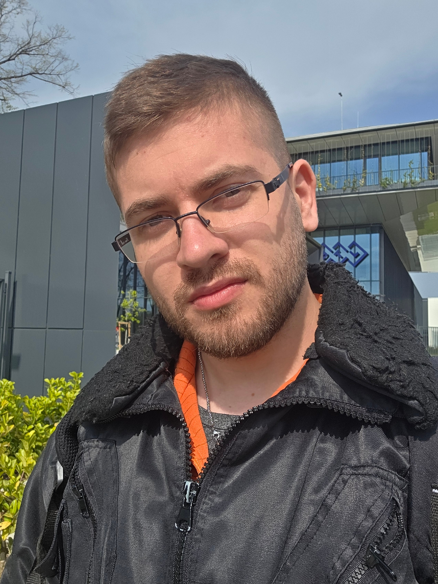 A fair-skinned man with short brown hair and a beard is the focus of the image, wearing glasses and a black jacket with an orange lining. He stands outdoors, likely in front of the UniCredit Bulbank b…read more