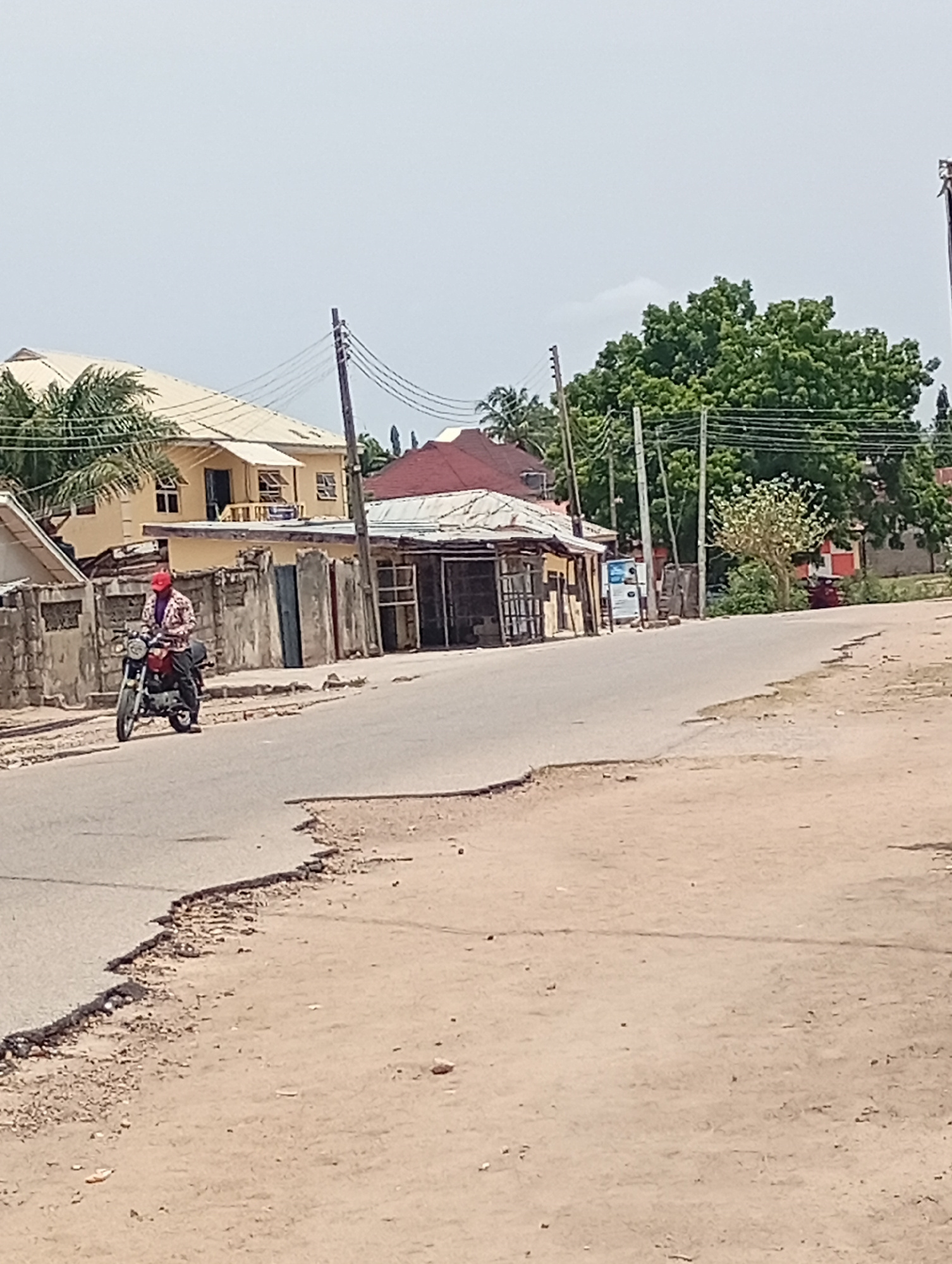 A street scene in Adankolo, Nigeria, shows a man riding a motorcycle on a paved road with damaged edges. The rider wears a red head covering and patterned shirt. Buildings line the road, including a p…read more