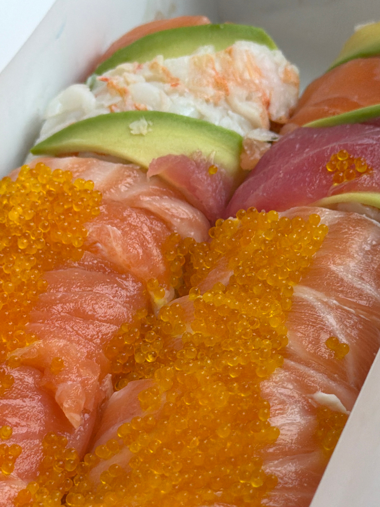 The image shows a close-up of two pieces of sushi. The sushi pieces are arranged in a stack within a white container. The bottom piece appears to be made with avocado slices, crab meat, and salmon. Th…read more
