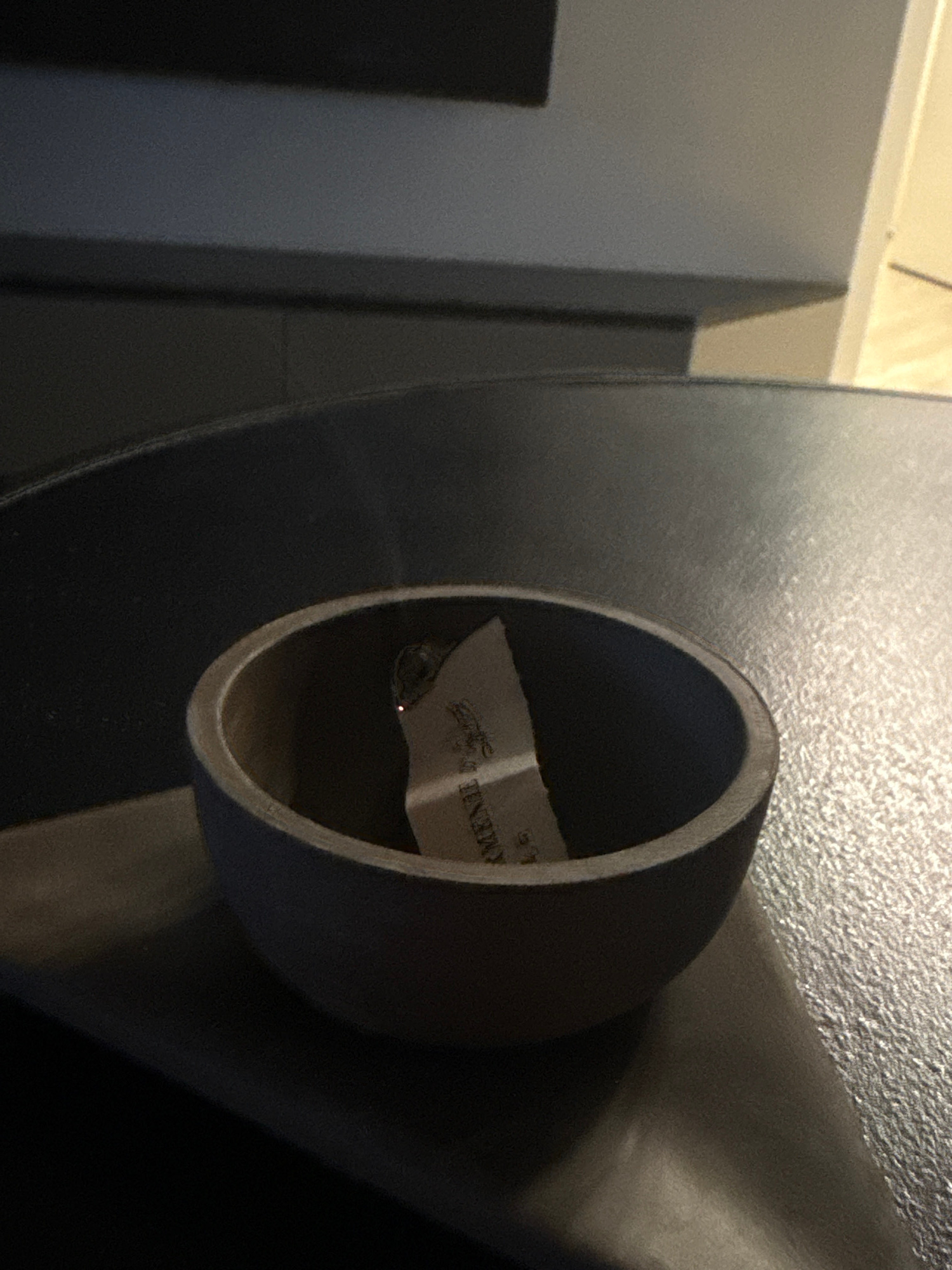 A close-up shot shows a dark, round, hollow object mounted on a larger, textured, dark surface. Inside the hollow object, a small piece of paper with illegible writing is visible. To the left of the o…read more