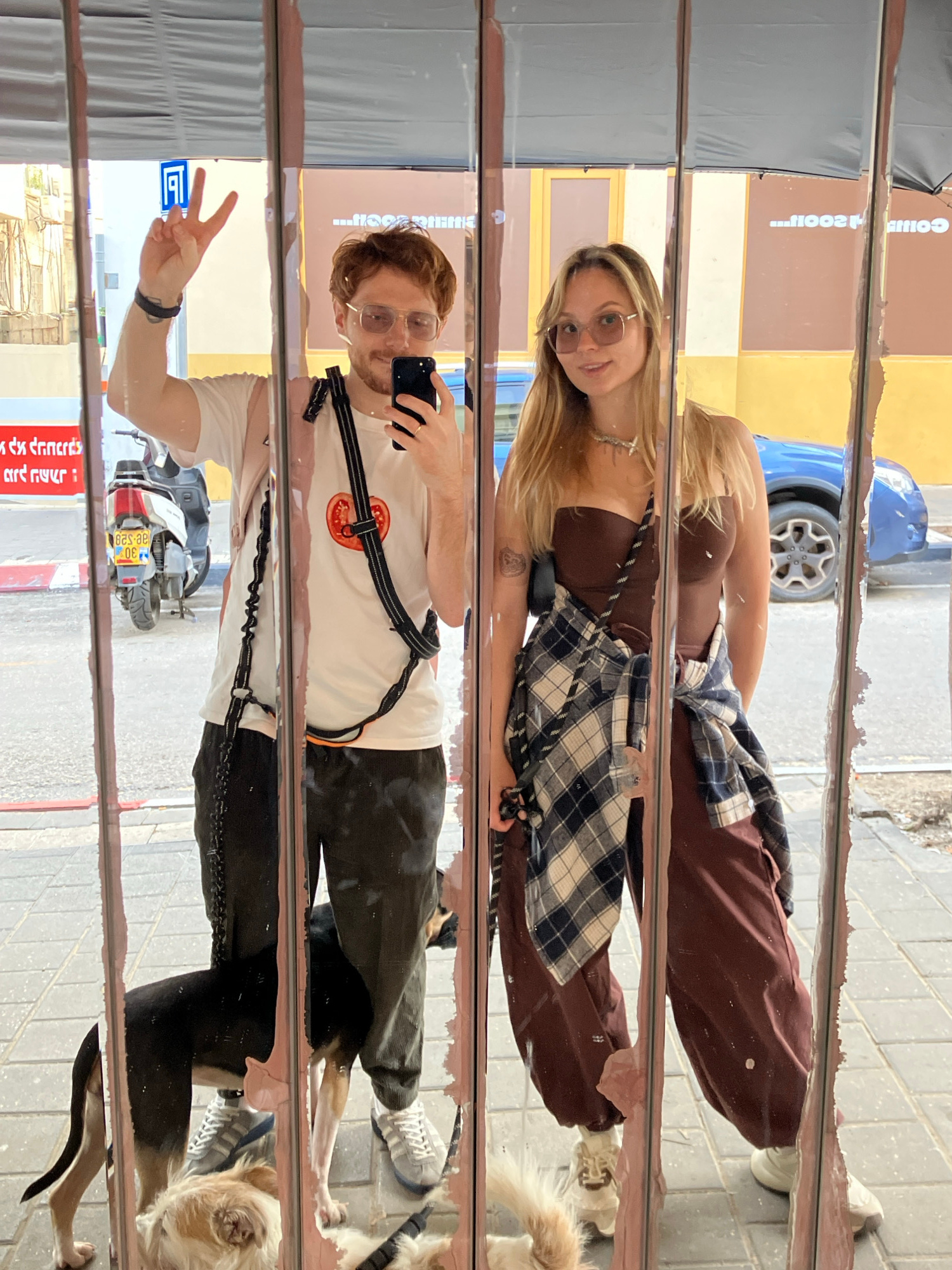 The image displays a reflection in a vertically segmented, somewhat damaged mirror, showing two individuals and two dogs on a paved sidewalk. The reflected background reveals an urban street scene in…read more