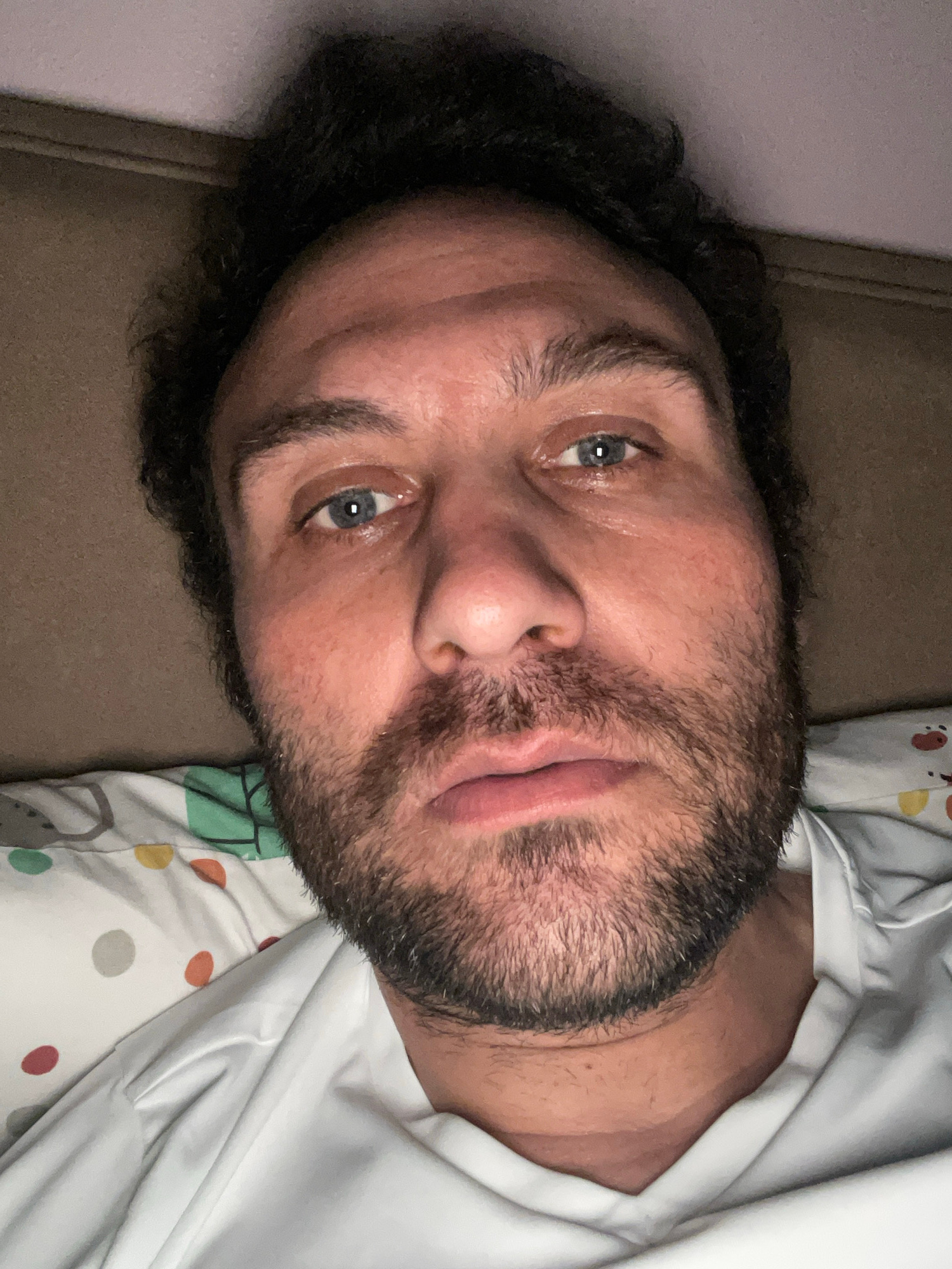 A medium close-up shot depicts a man with fair skin, dark curly hair, and a beard, resting his head on a brown surface, potentially a couch or pillow. He has blue eyes and a neutral expression. He app…read more