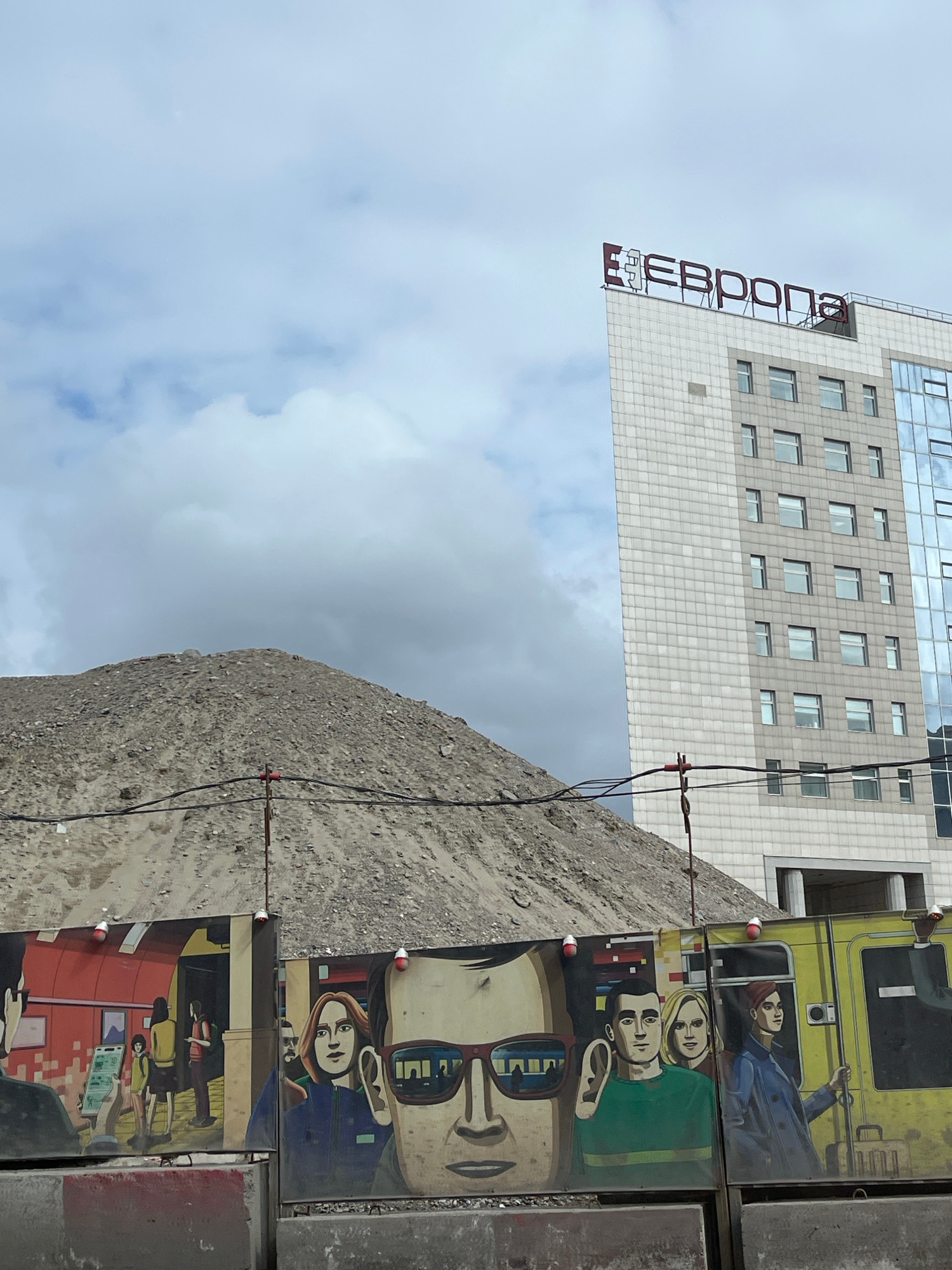 The image shows a street scene in Krasnoyarsk, Russia. In the background is the Hotel "Europe" (Европа) building, a modern high-rise with a glass and light-colored facade. In the mid-ground, there's a…read more