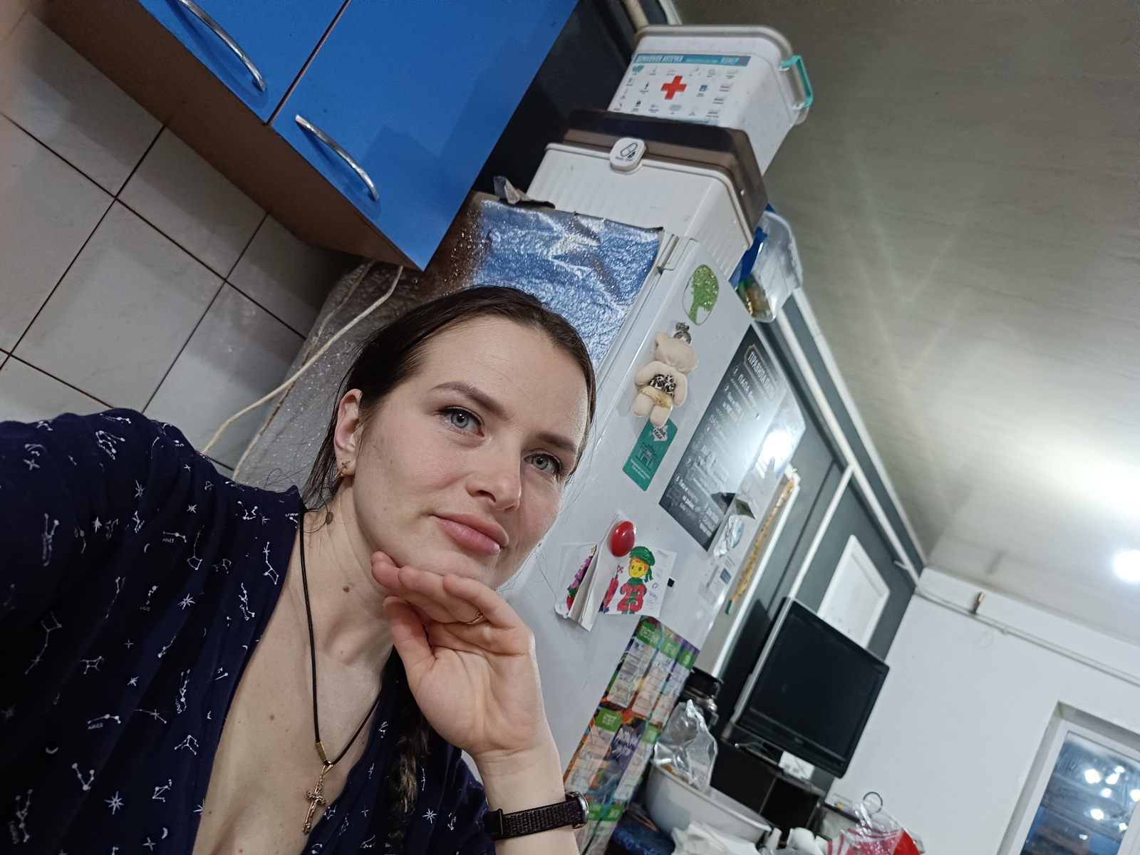 A woman is in a kitchen, resting her chin on her hand and facing the camera. She has light eyes and her hair is pulled back. She wears a dark, constellation-patterned shirt and a necklace with a cross…read more