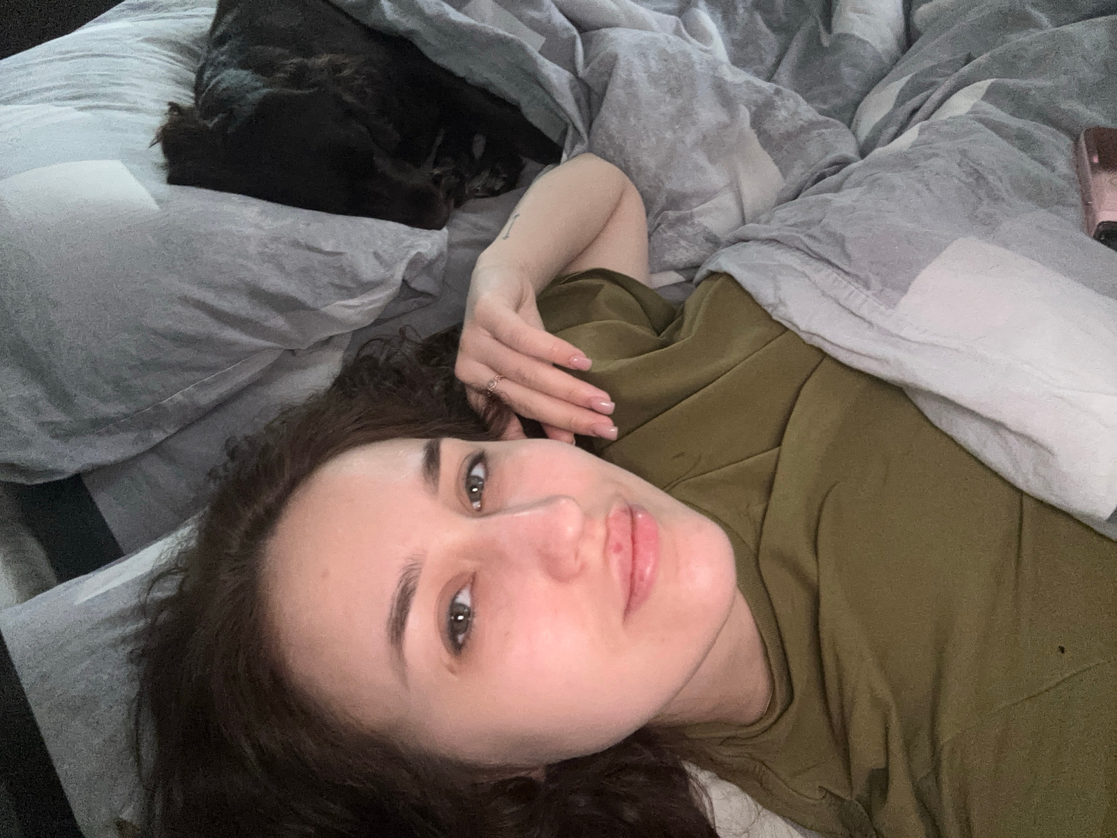 A woman is lying in bed with a dark-colored dog, presumably in a residential location in Марковский, Russia. The woman is wearing an olive-green shirt and has dark, curly hair. She is looking directly…read more