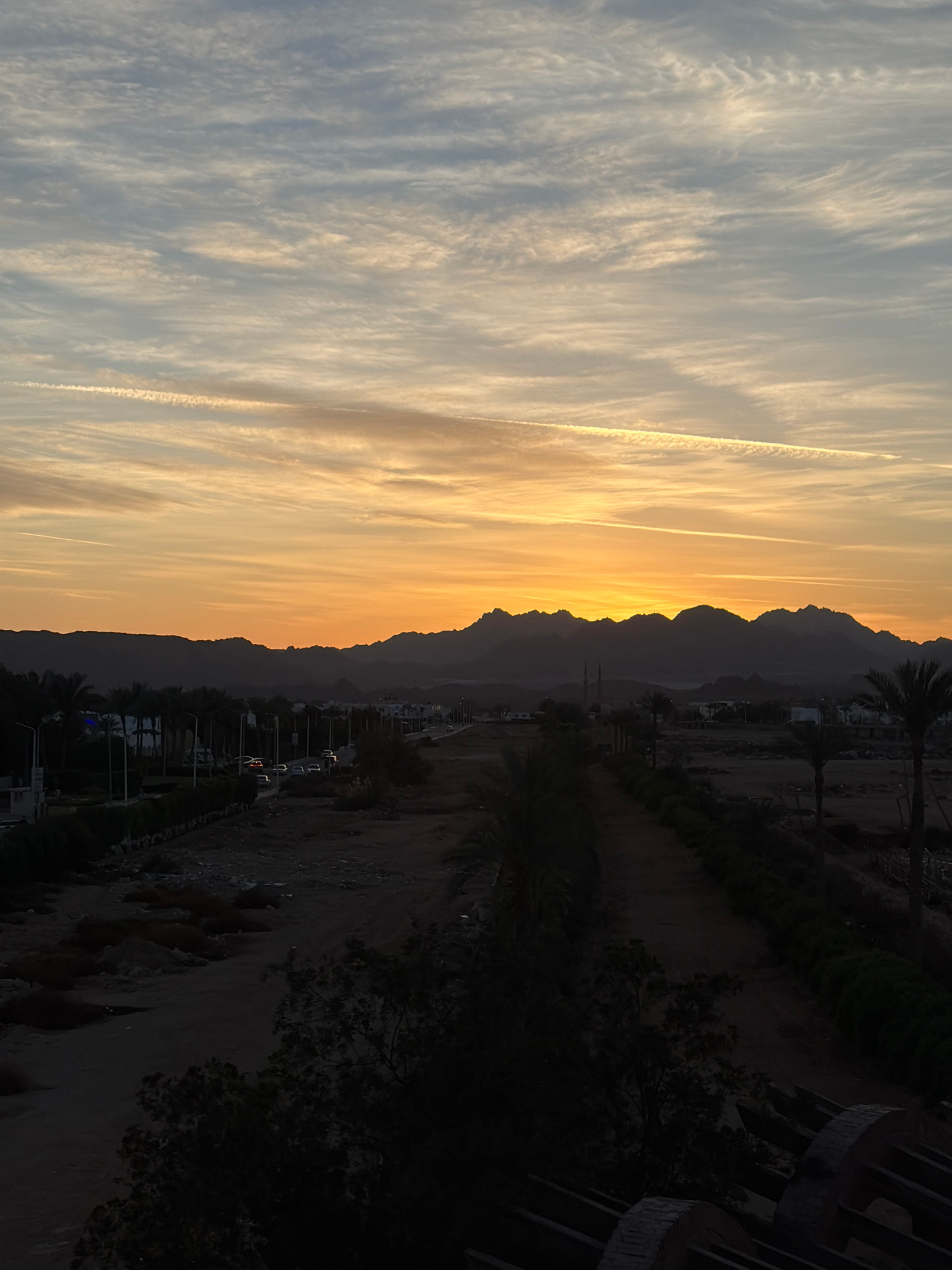 The image captures a horizontal view of Sharm El Sheikh, Egypt, at either sunset or sunrise, as suggested by the warm orange and yellow hues in the sky. Silhouetted mountains form the horizon, with pa…read more