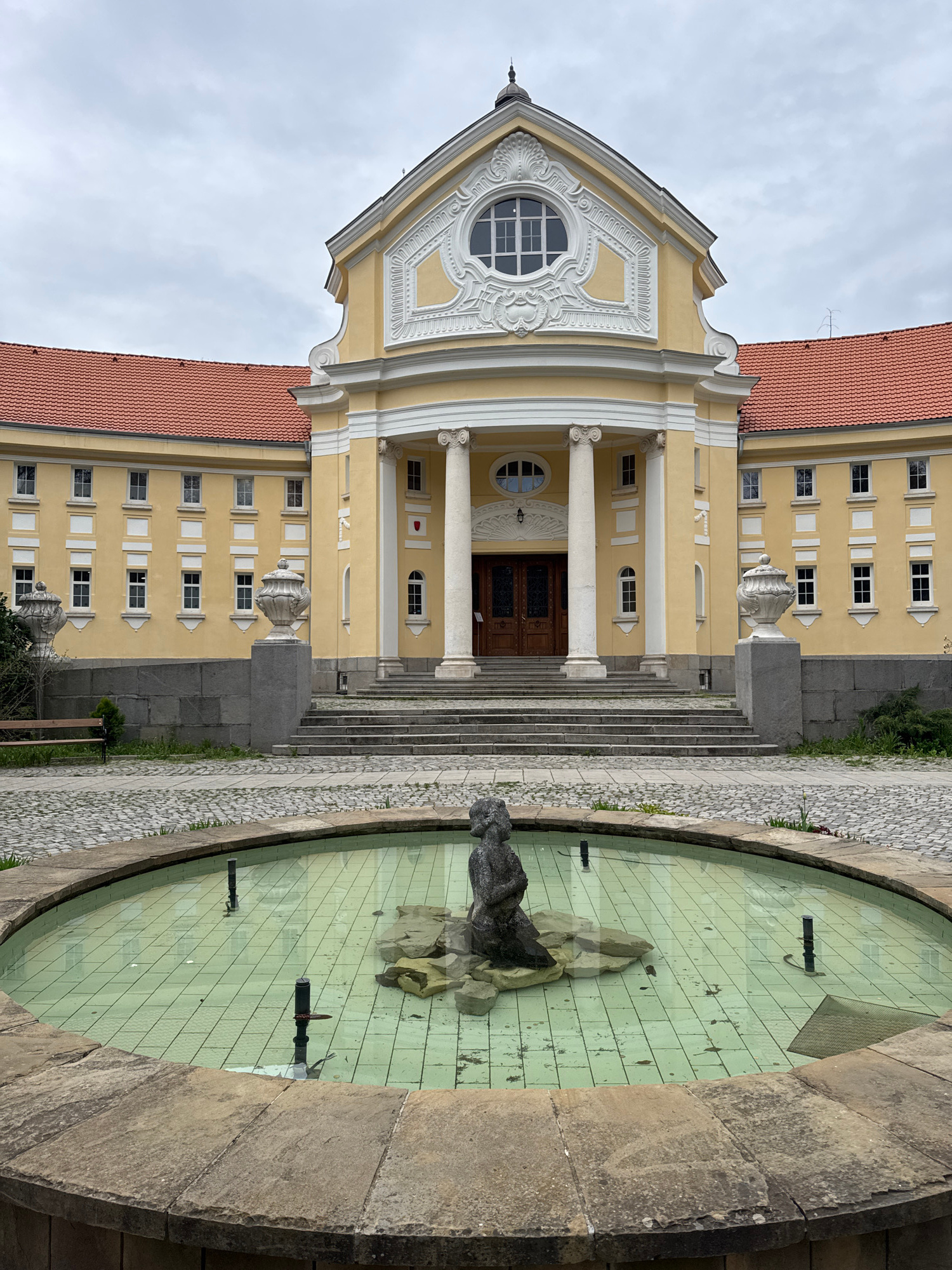 The image depicts a building in Bankya, Bulgaria, adjacent to a circular fountain. The building has a yellow facade, red tile roof, and white architectural details like columns and window casings. A t…read more