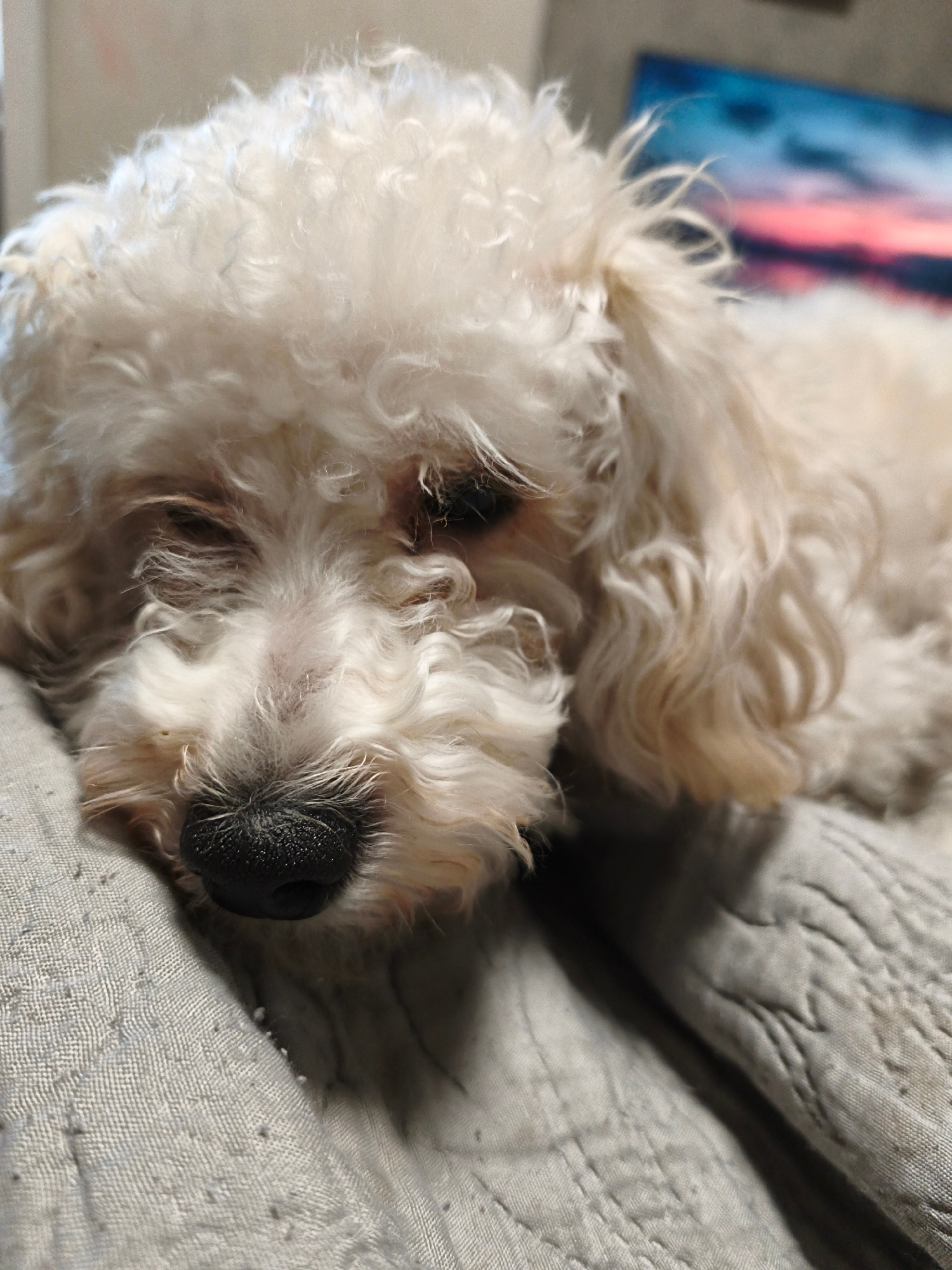 A white, curly-haired dog, resembling a poodle or Bichon Frise, is captured in a close-up, horizontal shot. The dog is resting its head, appearing to be asleep or very relaxed, on a light grey, textur…read more