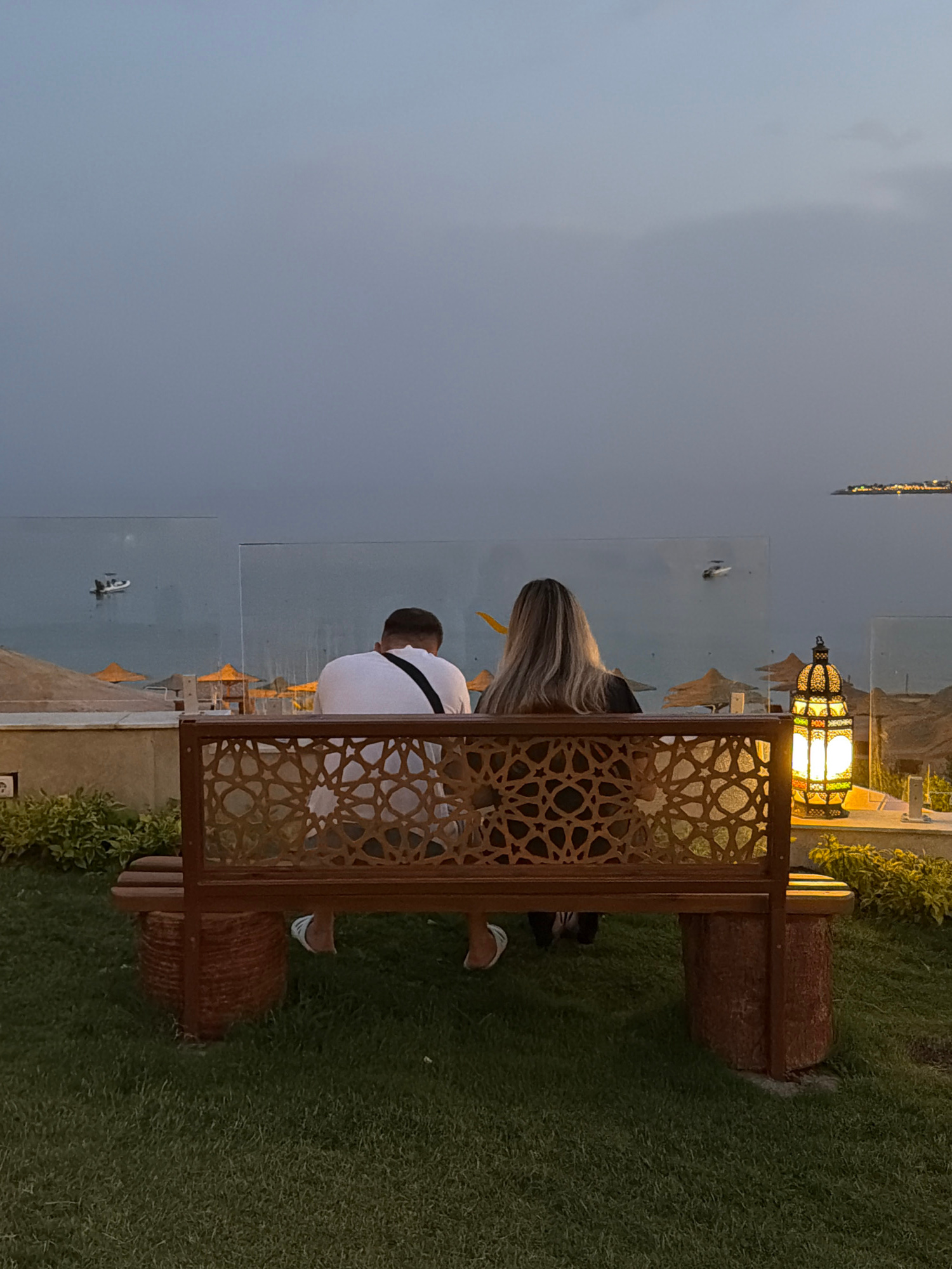 A couple sits on a bench at night in Sharm El Sheikh, Egypt. The woman has long blonde hair and wears dark clothing. The man has dark hair and a white shirt with a black strap across his back. The ben…read more