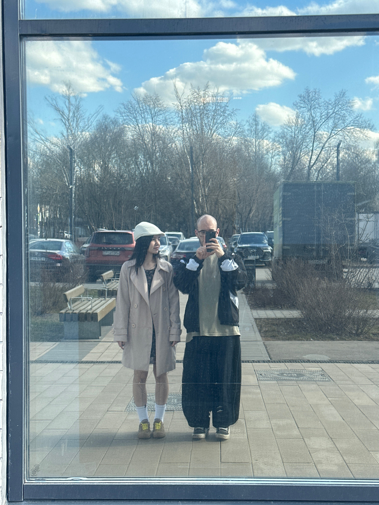A reflection in a glass window shows two individuals standing on a paved surface in Lyubertsy, Russia. The reflected figures include a person in a long beige coat and a white hat, and another in a bla…read more