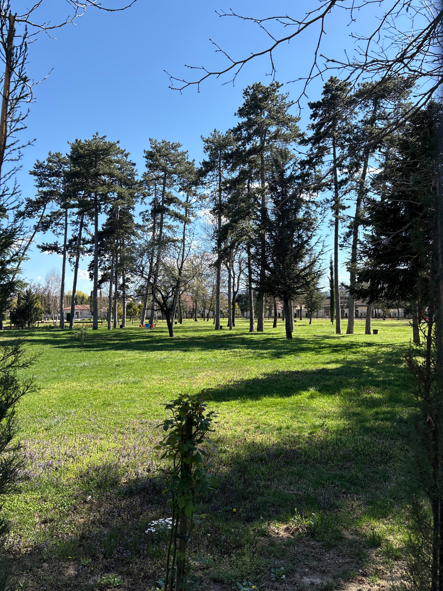 The image depicts a park in Kazanlak, Bulgaria, characterized by rows of tall, mature trees lining a grassy expanse. The trees cast elongated shadows across the green lawn, indicating a sunny day. The…read more