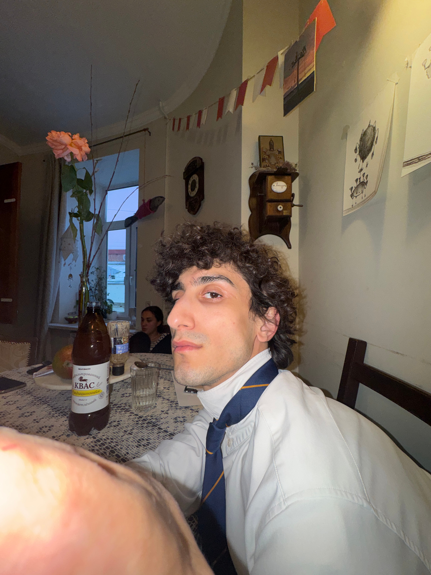 The image shows a man with curly hair wearing a white shirt and a blue and gold striped tie, seemingly sitting at a table in a room. There is a bottle of "Kvass Traditional" on the table, along with o…read more