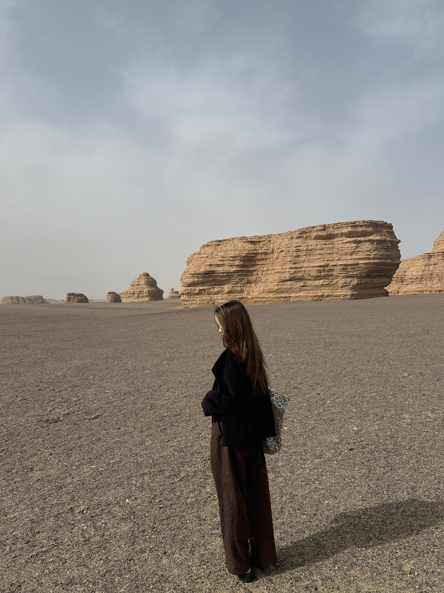 The image captures a landscape in Dunhuang City, China. A person stands on a gravelly surface, wearing a black jacket and brown pants. The background reveals a formation of tall, brown, rock structure…read more