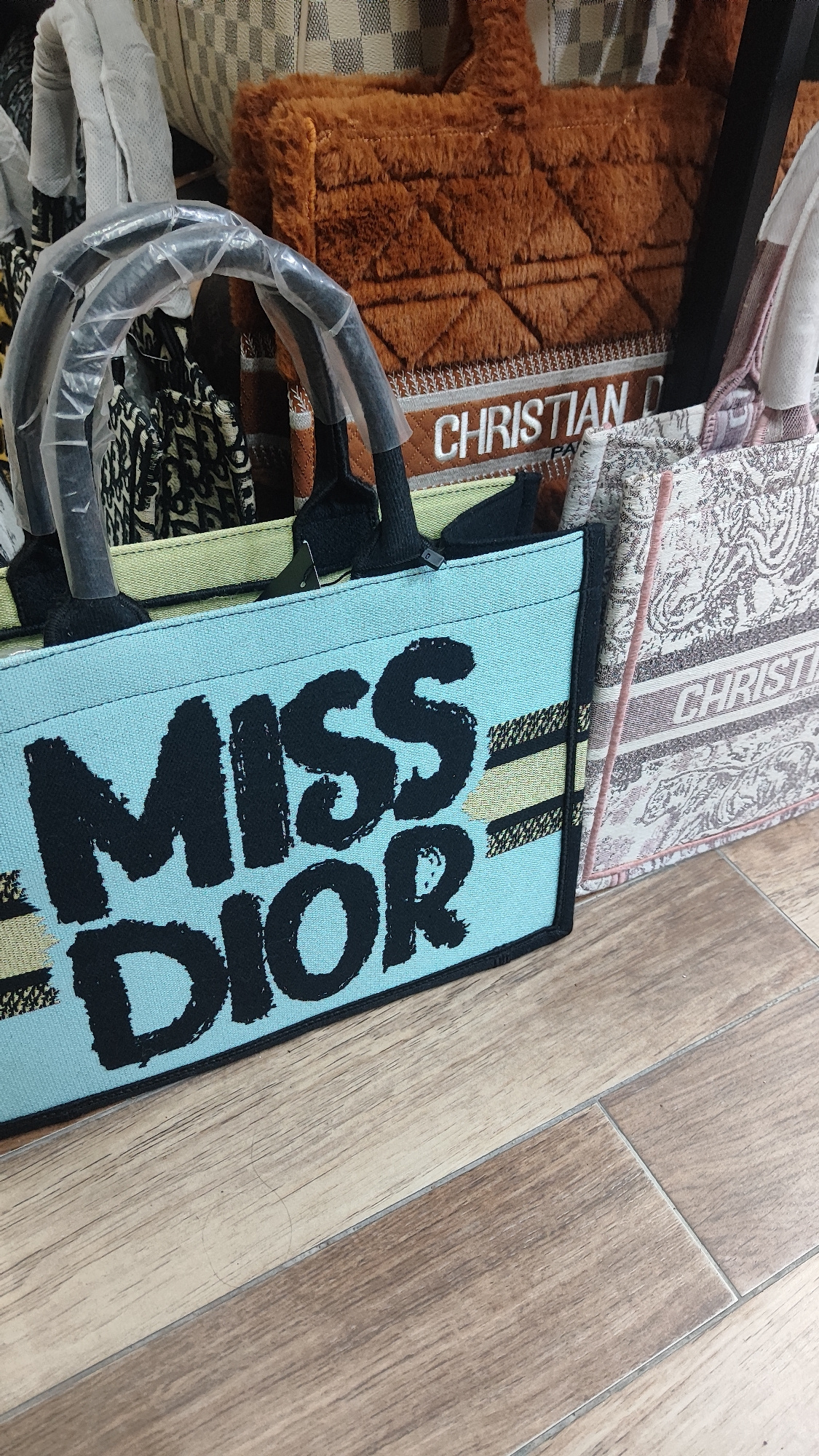 The image depicts a close-up of several handbags, most prominently a blue canvas tote bag with "MISS DIOR" printed in large, bold black letters. The handles are covered in clear plastic. To the right…read more