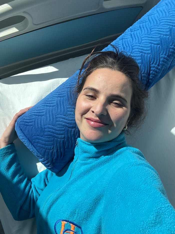 The image displays a female subject, appearing to be in her 20s or 30s, lying down and facing the camera. She has dark brown hair, brown eyes, and is smiling with slightly parted lips adorned with lig…read more