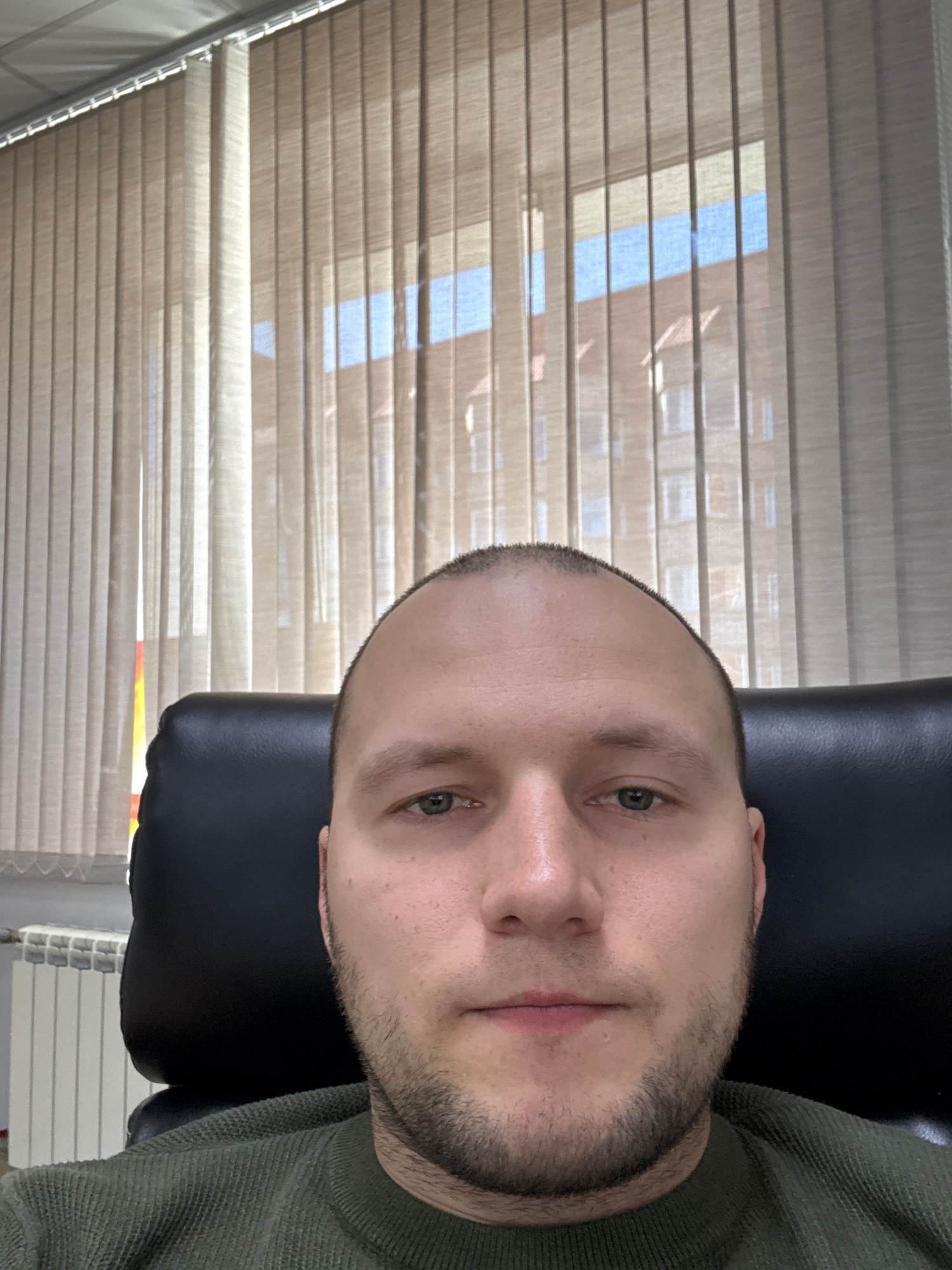 A man is sitting in a black leather chair in front of a window with beige blinds. Light streams through the blinds, revealing a glimpse of blue sky. The man has short hair and a stubbly beard. He wear…read more