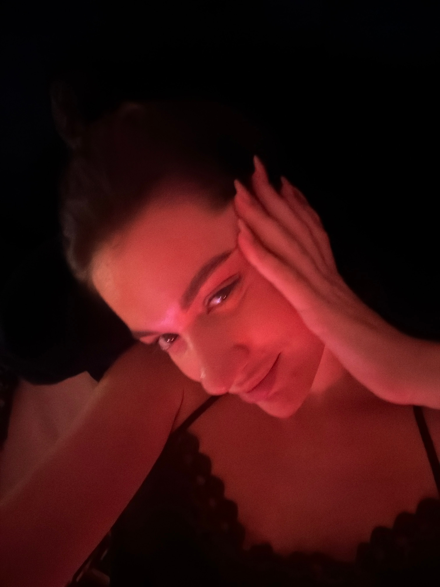 A photograph shows a woman lying down, facing the camera, with a hand resting on her forehead. The scene is dimly lit with a red light source. The woman has visible eyebrows and appears to be wearing…read more