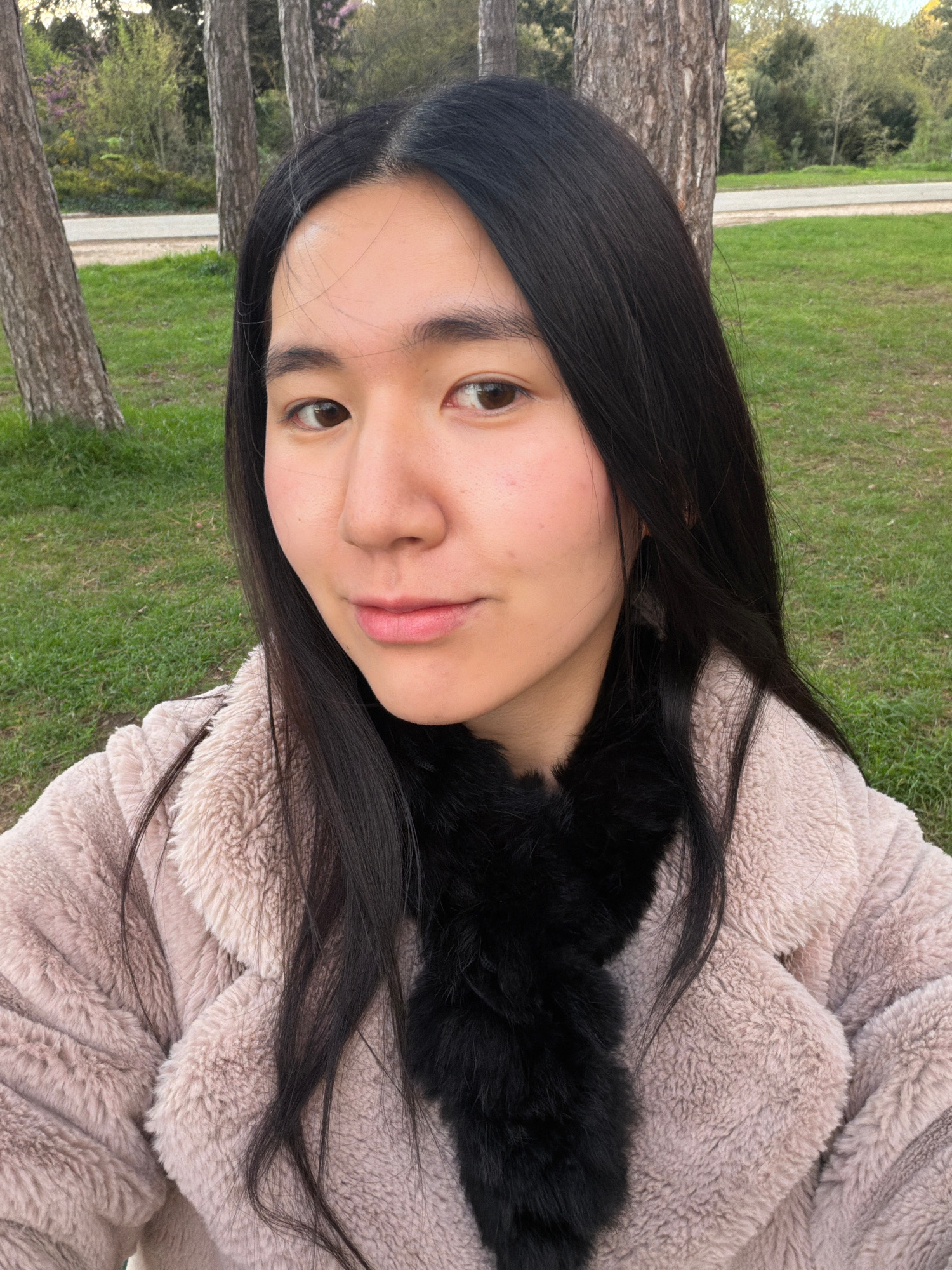 A young woman is photographed outdoors. She is wearing a beige furry coat with a black fur collar. She has long, dark hair and light brown eyes. The background consists of green grass and trees, sugge…read more