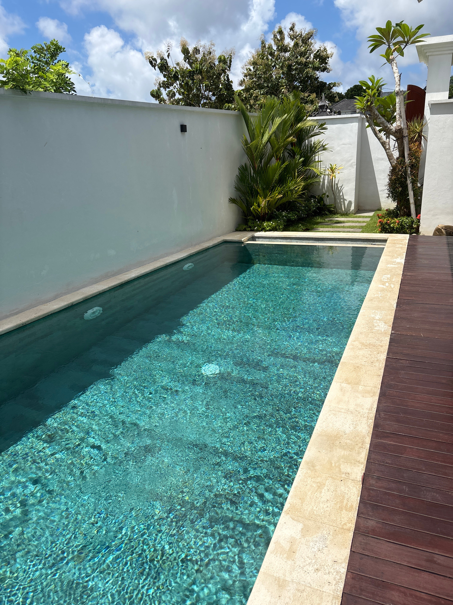 The image captures a swimming pool in Ungasan, Indonesia. The pool's water appears turquoise and ripples with sunlight. A wooden deck borders one side of the pool, separated by a light-colored stone b…read more