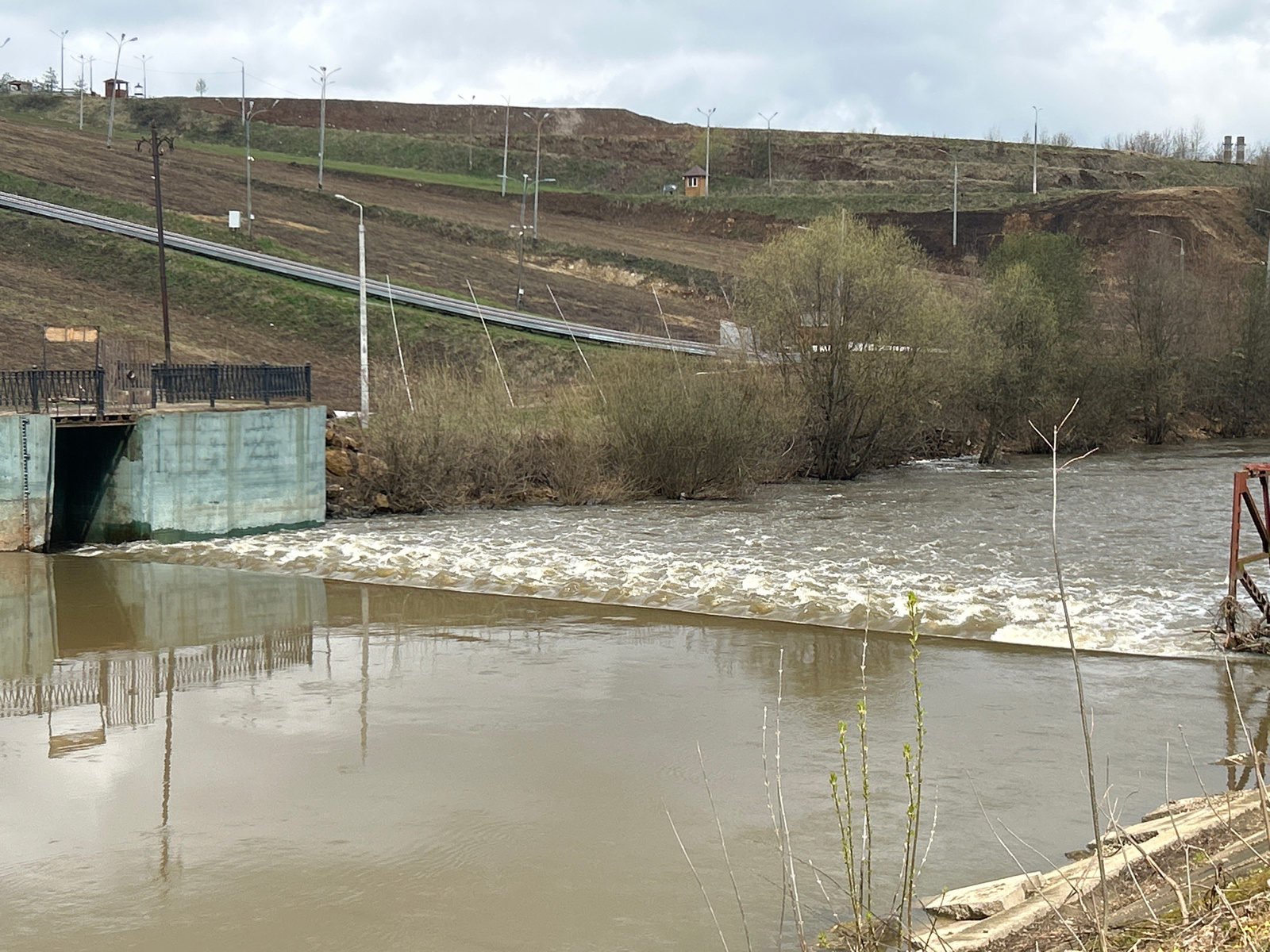 The image displays an outdoor scene featuring a river and a developed hillside under an overcast sky. A brownish-grey river flows from left to right, with a concrete weir or small dam creating a stret…read more