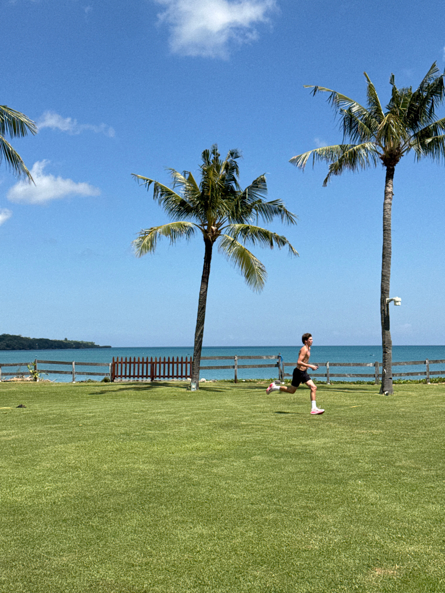 The image shows a tropical outdoor scene, possibly in Kuta Selatan, Indonesia, given the presence of palm trees and a beach setting. A man with dark hair is captured mid-air, seemingly performing a ju…read more