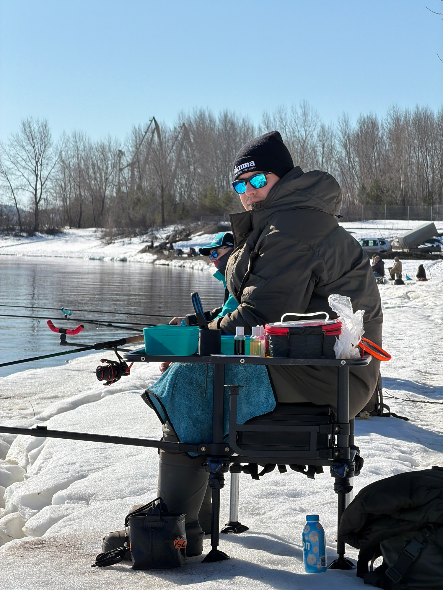 A man is fishing on a snow-covered river in Chaikovsky, Russia. He is wearing a dark green coat, a black hat, and blue mirrored sunglasses. He is sitting on a black fishing platform, with a fishing ro…read more
