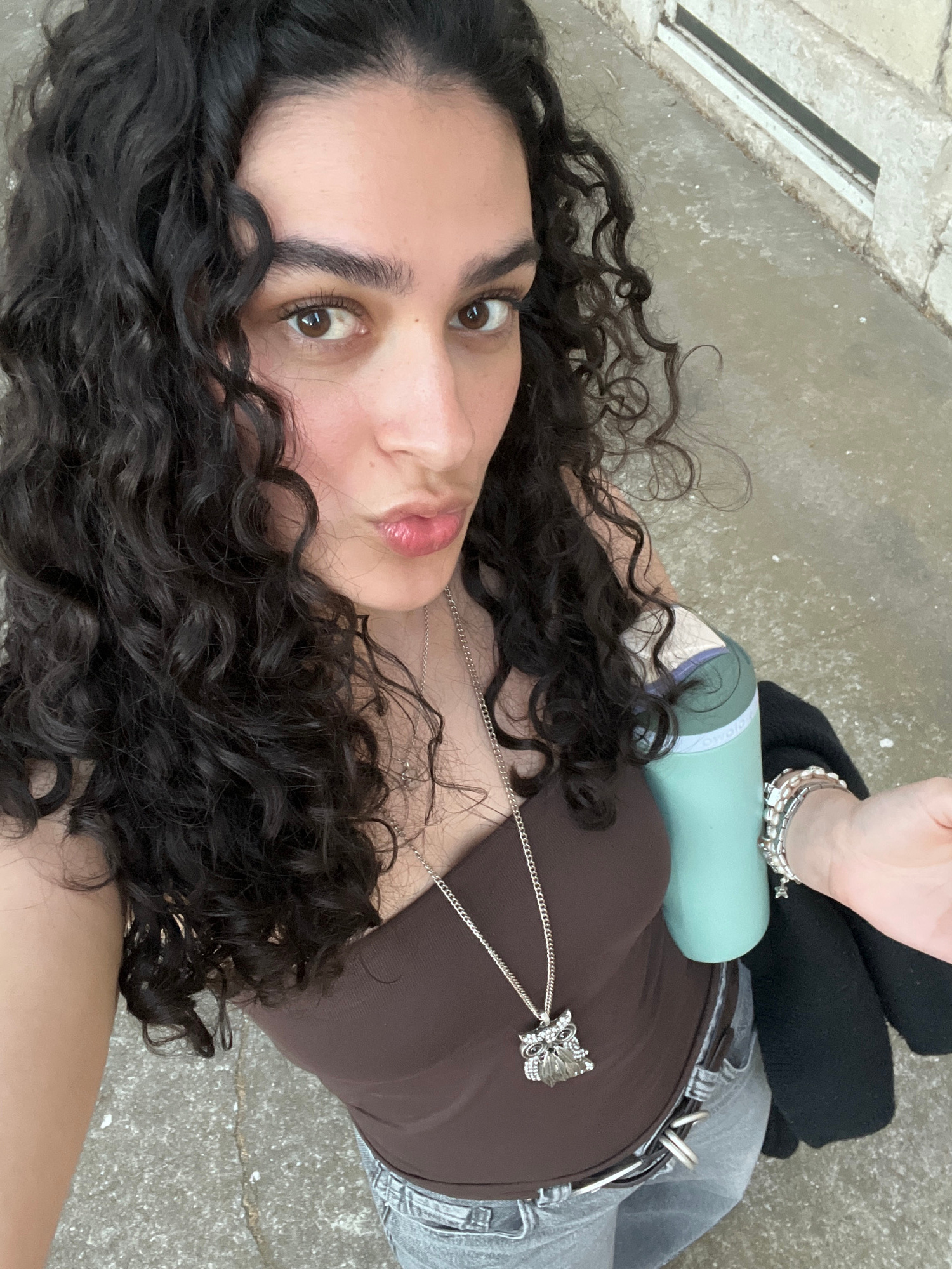 A young woman with dark, curly hair and fair skin is lying on a concrete surface, possibly outdoors. She is wearing a brown top with a silver necklace featuring an owl pendant. She is also wearing graβ¦read more