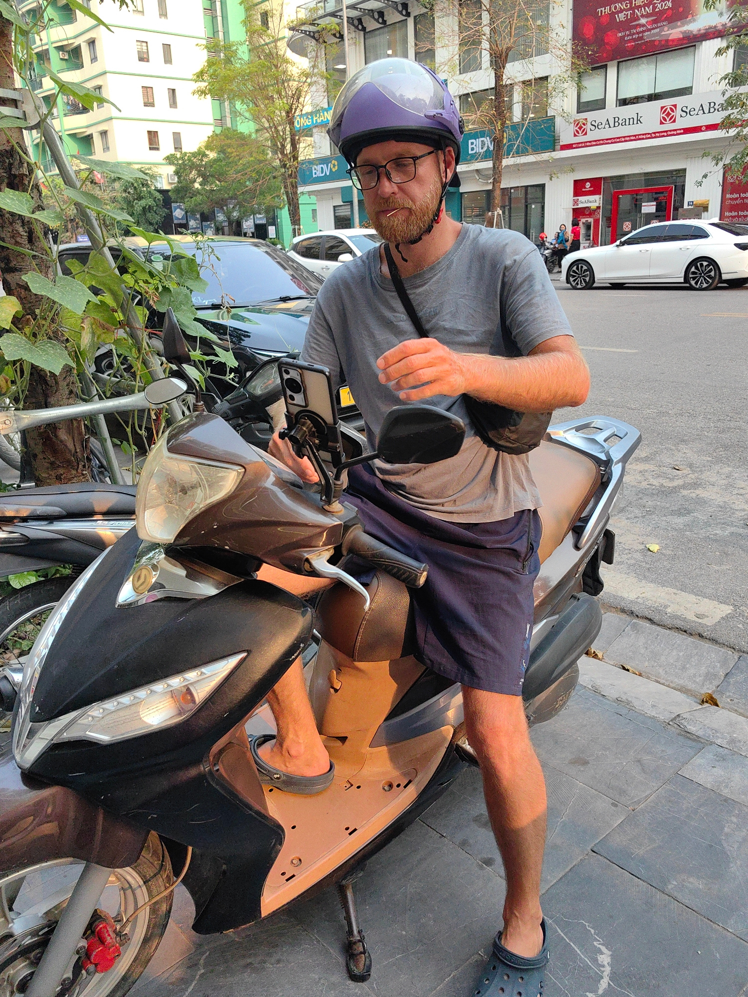 An eye-level, full shot features a Caucasian male seated on a brown scooter parked on a street in Hong Gai Ward, Vietnam. The man is wearing a grey t-shirt, navy shorts, dark blue Crocs, glasses, and…read more