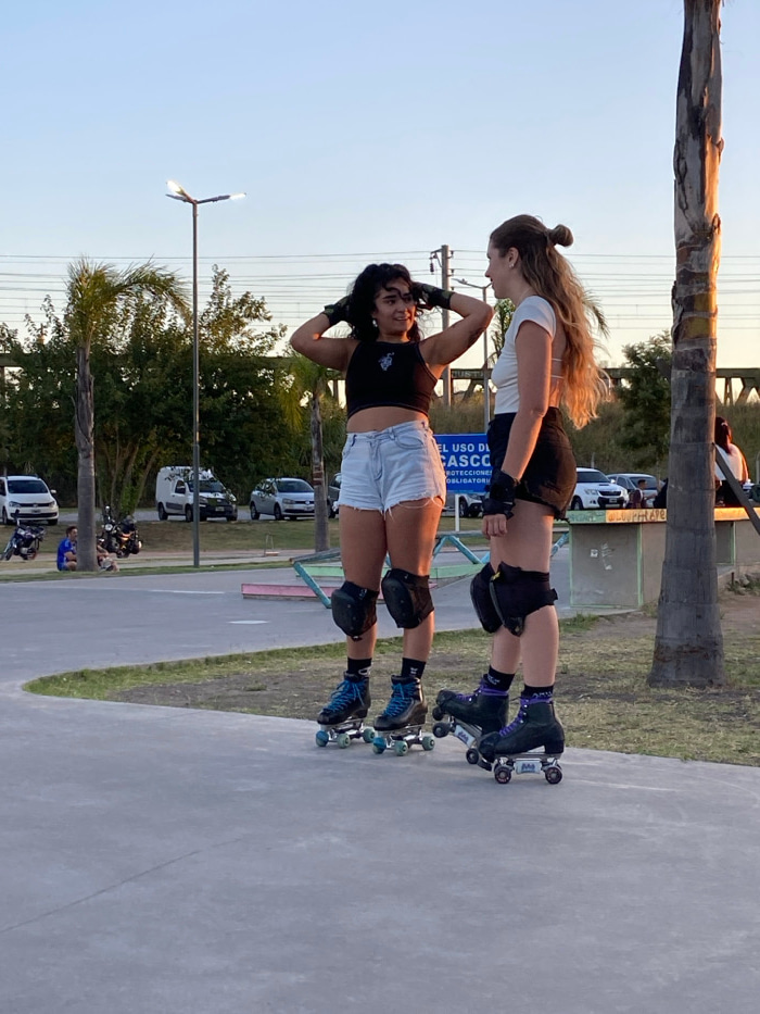 Two young women stand back-to-back on roller skates on a concrete surface. Both wear knee pads and wrist guards. The woman in front wears a black top and light-colored shorts, while the woman behind w…read more
