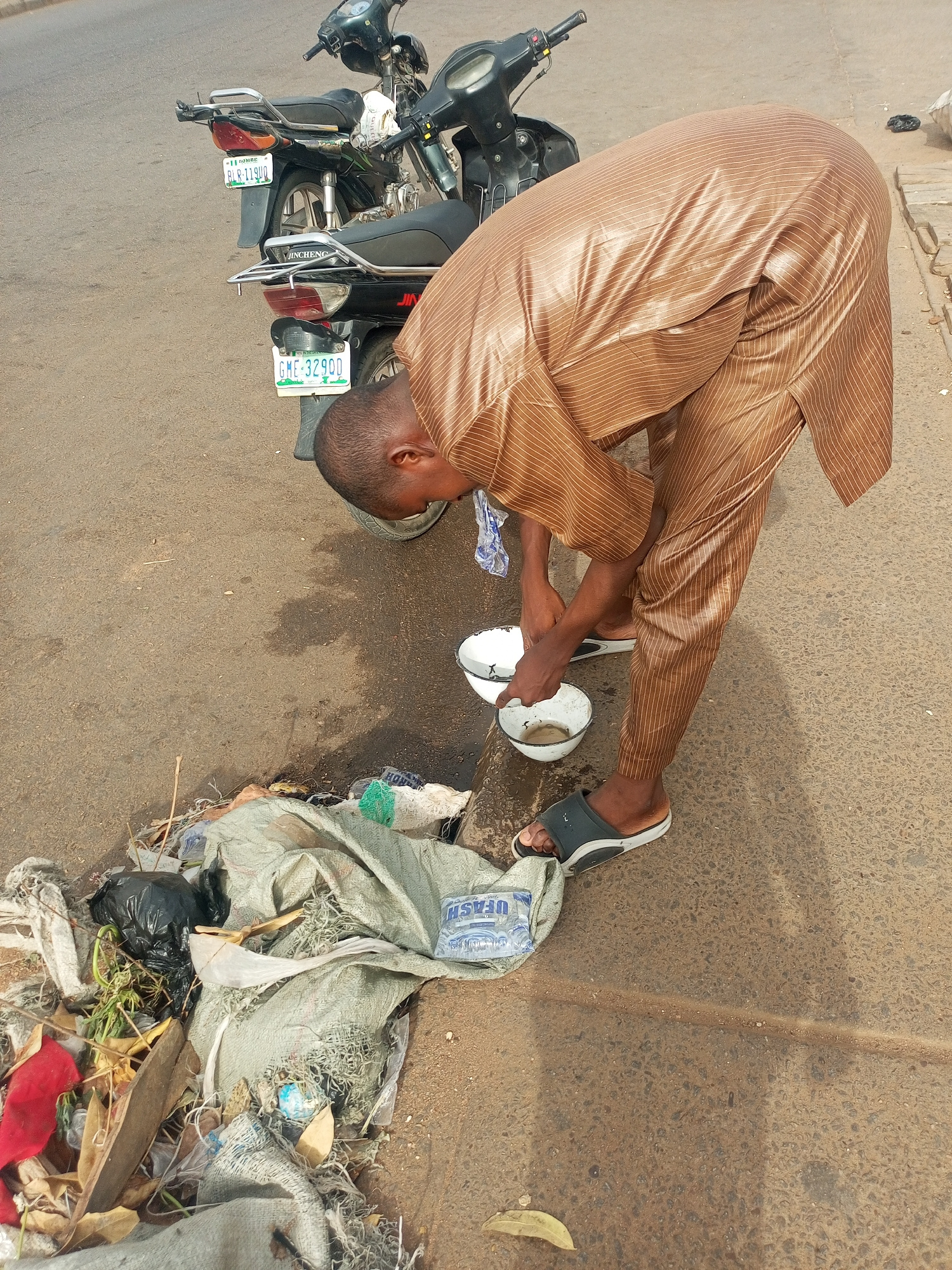 A man wearing a brown, striped robe and dark sandals is bending over a pile of trash on a street in Nigeria. He is holding two white bowls that appear to contain a liquid, possibly water. Two motorcyc…read more